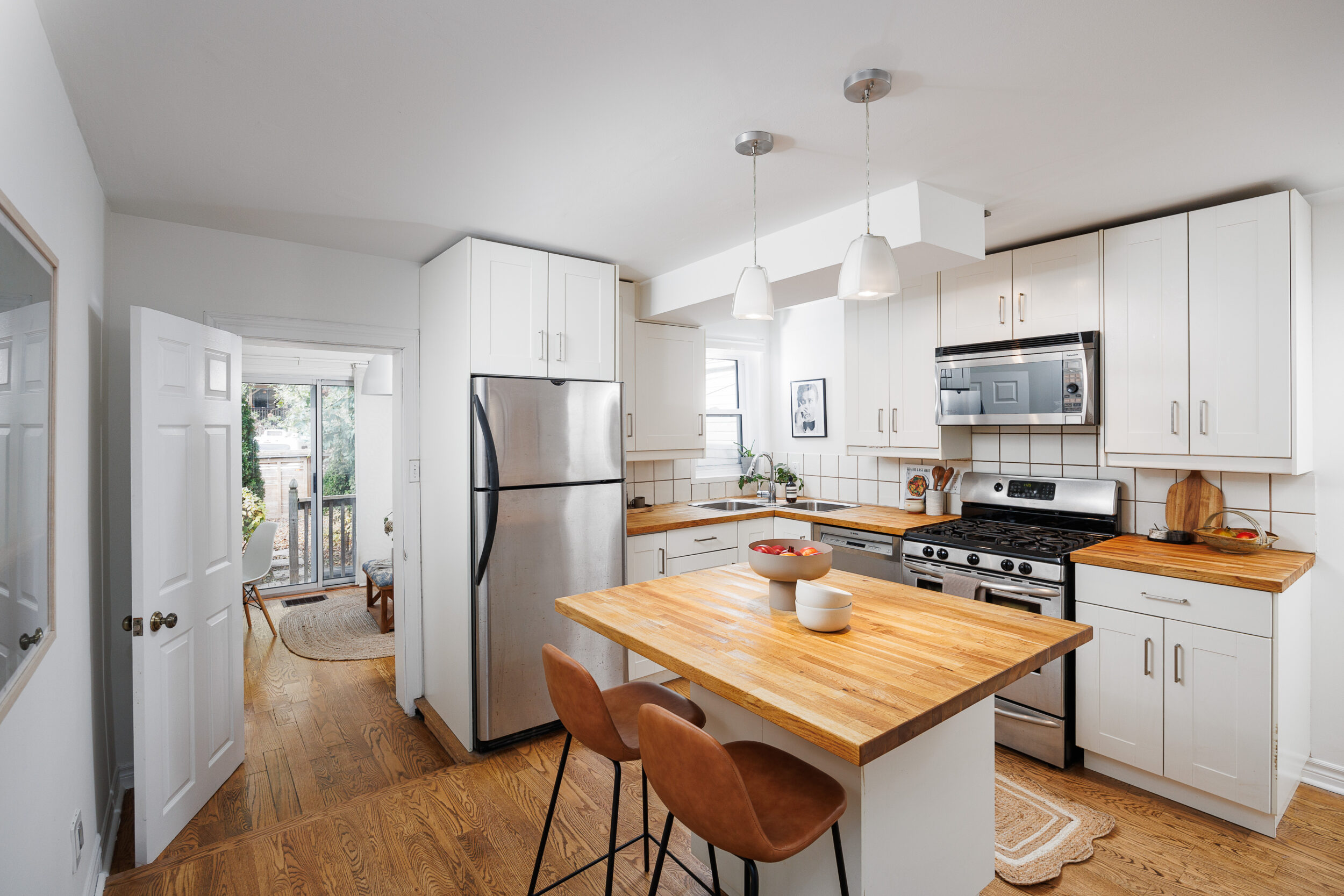 Tucked under a canopy of fall leaves, the house with the orange door beckons you in. The enclosed porch gives you space to wipe the dog’s paws, park the bike, or just decompress. Enter into the warmth of the living room, a cozy spot to watch movies, entertain, or curl up with a book. The stairs of this charming century semi are a natural divide from the fabulous kitchen, with butcher block counters & island, subway tile, & stainless steel everything. Another sun-filled room can be the space of your dreams: Family room? Den? Dining room? Upstairs is a roomy primary with an east-facing window boasting sunrises & greenery, and a second bedroom with views of your backyard oasis. Fully-fenced, interlocking brick patio, gas line for BBQ, and a gorgeous deep lot. With Greenwood Park & Leslieville’s Farmers Market on one end of the street and the popular Betty’s East patio, bakeries, and breweries on the other, this sweet house on one of Leslieville’s best streets welcomes you home.