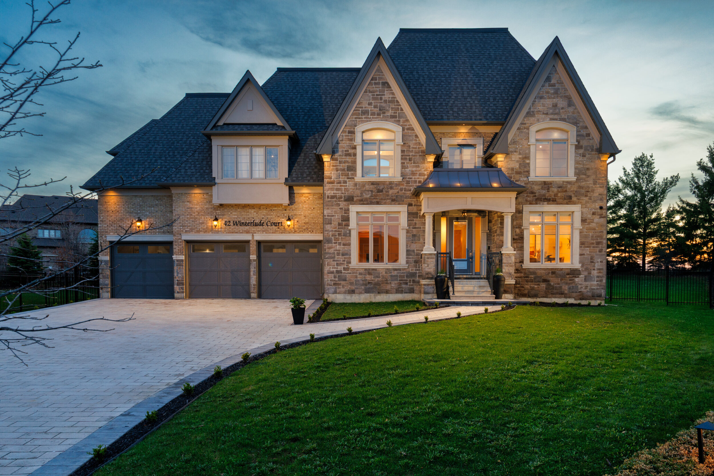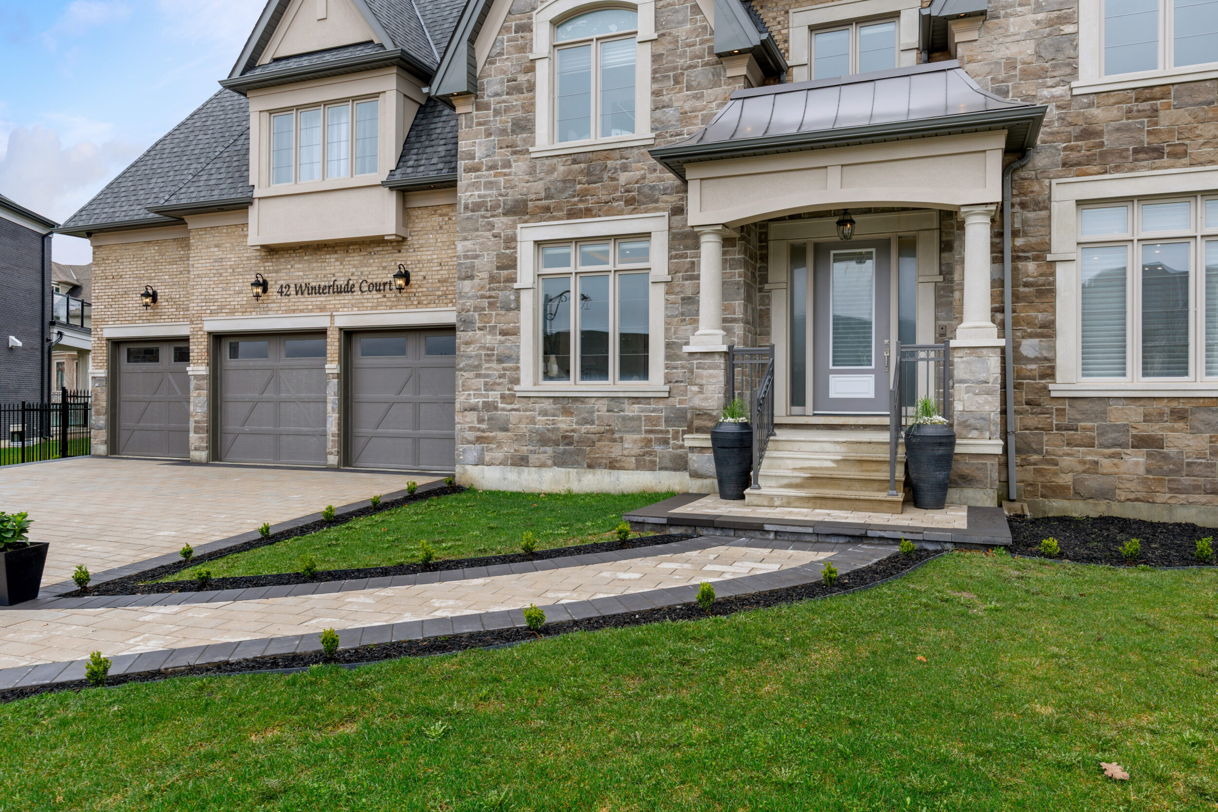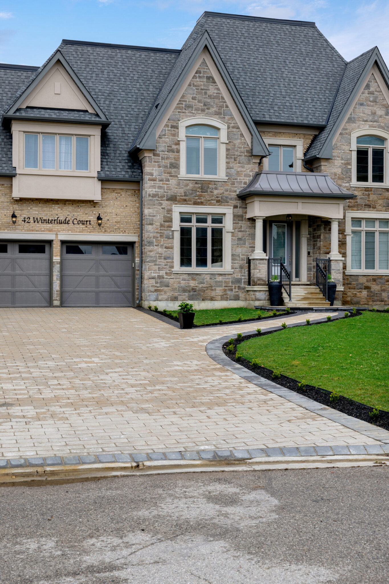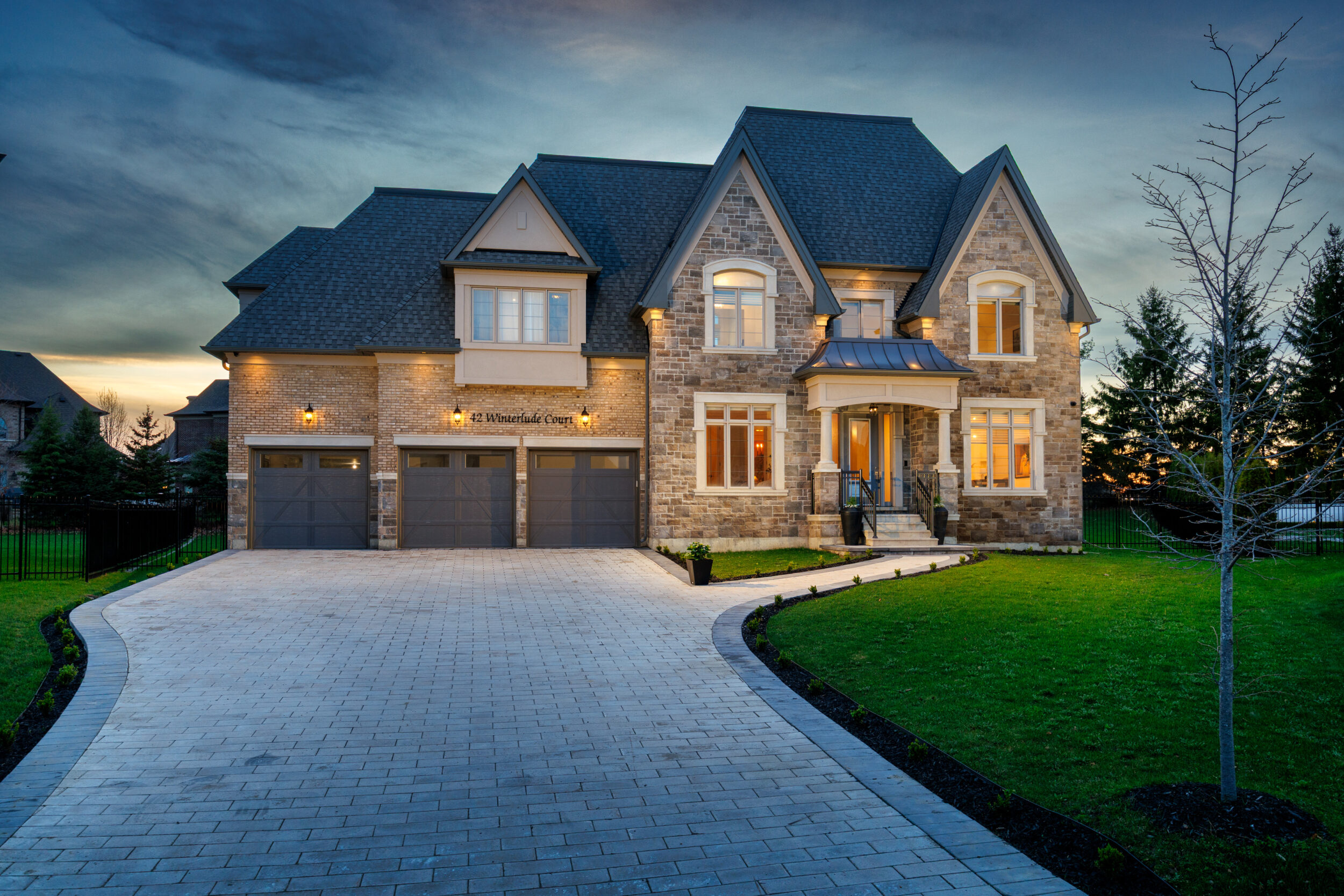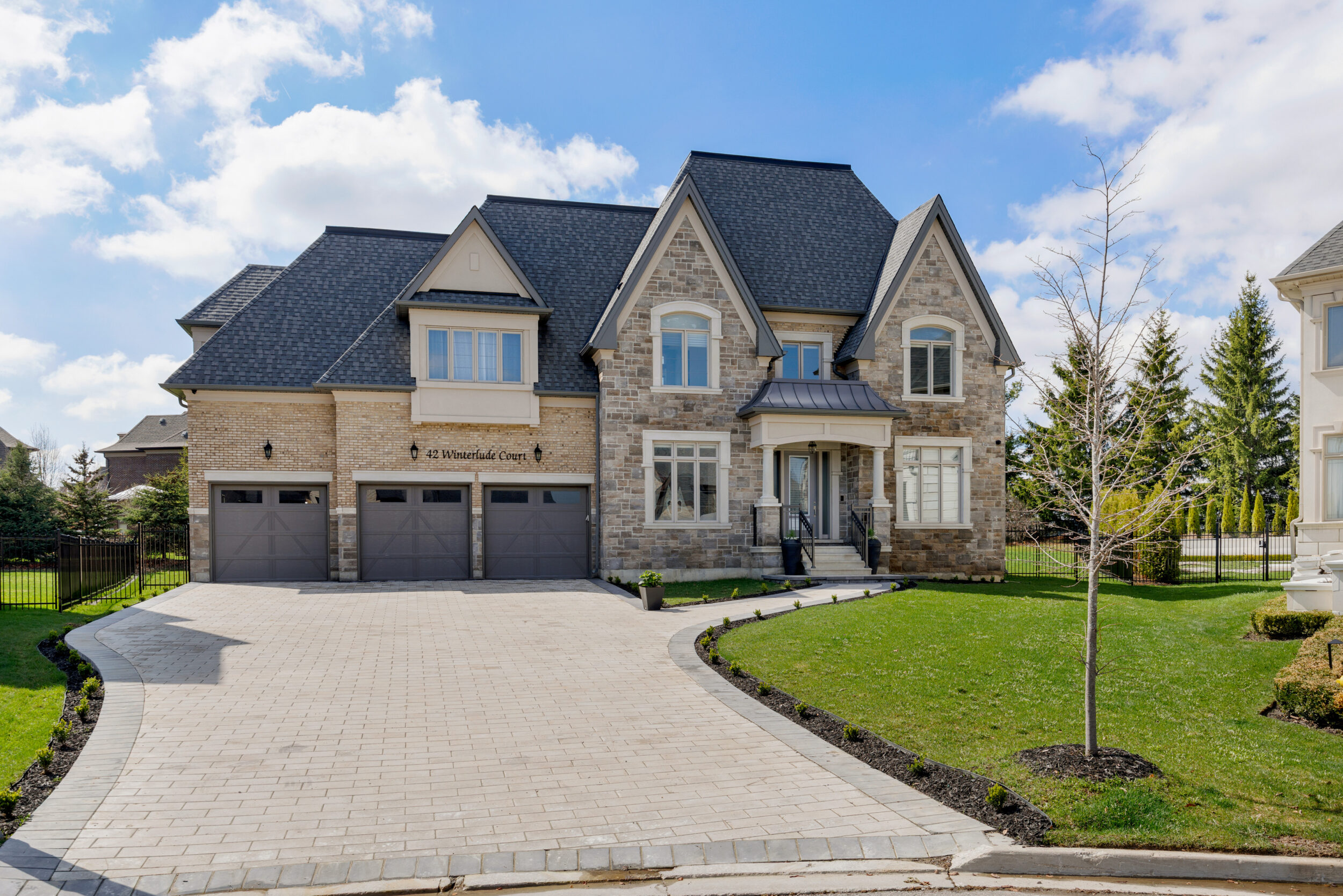 The exterior is pure stone, the kind that was not chosen, but earned and communicates permanence before you’ve touched the door. A tri-car garage with parking for four vehicles sits behind a herringbone paver driveway long enough to accommodate the collection. The standing-seam metal detail at the entry portico echoes the roofline’s charcoal accents above – the quiet signature of a builder who was showing off.