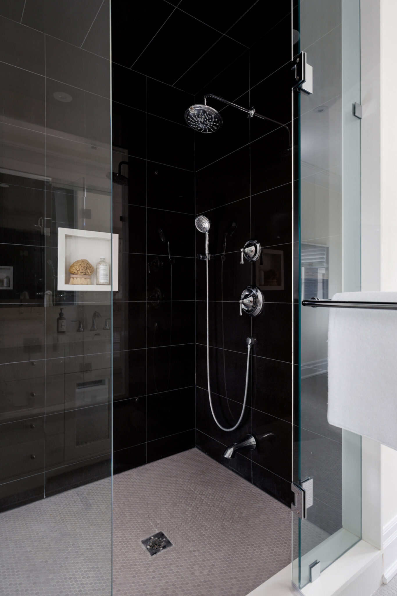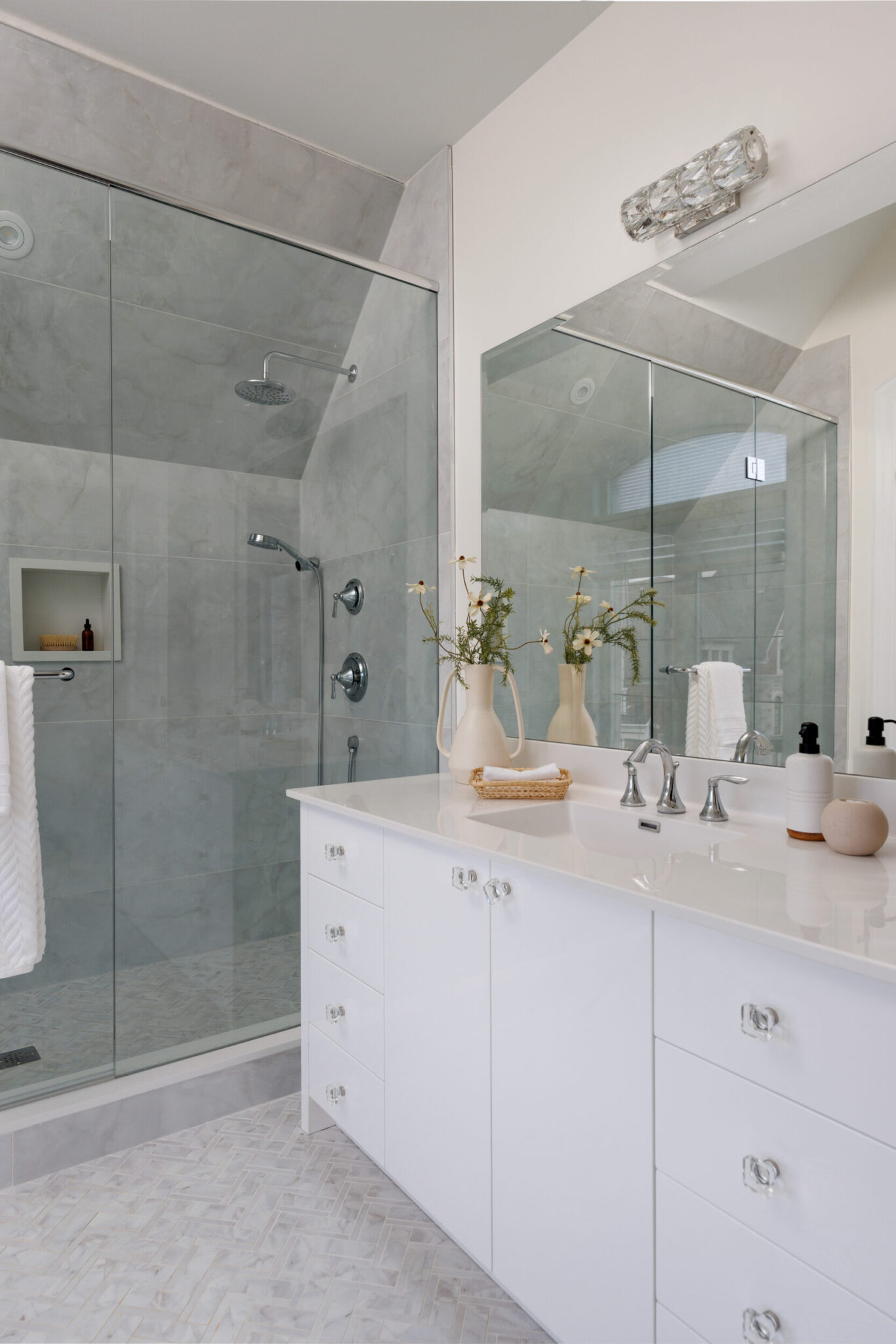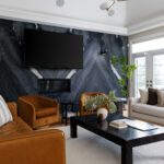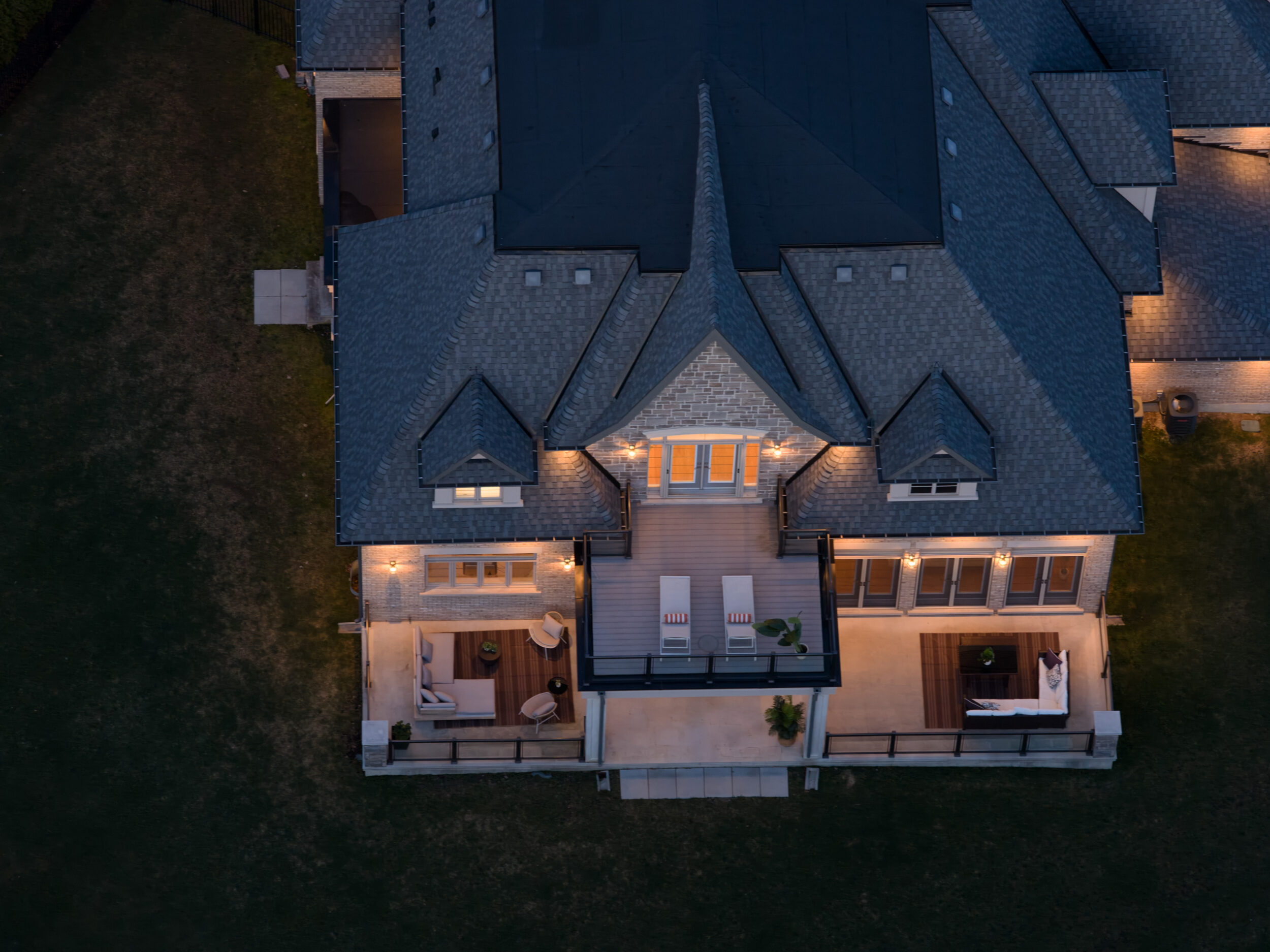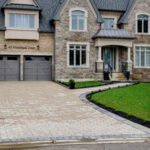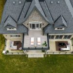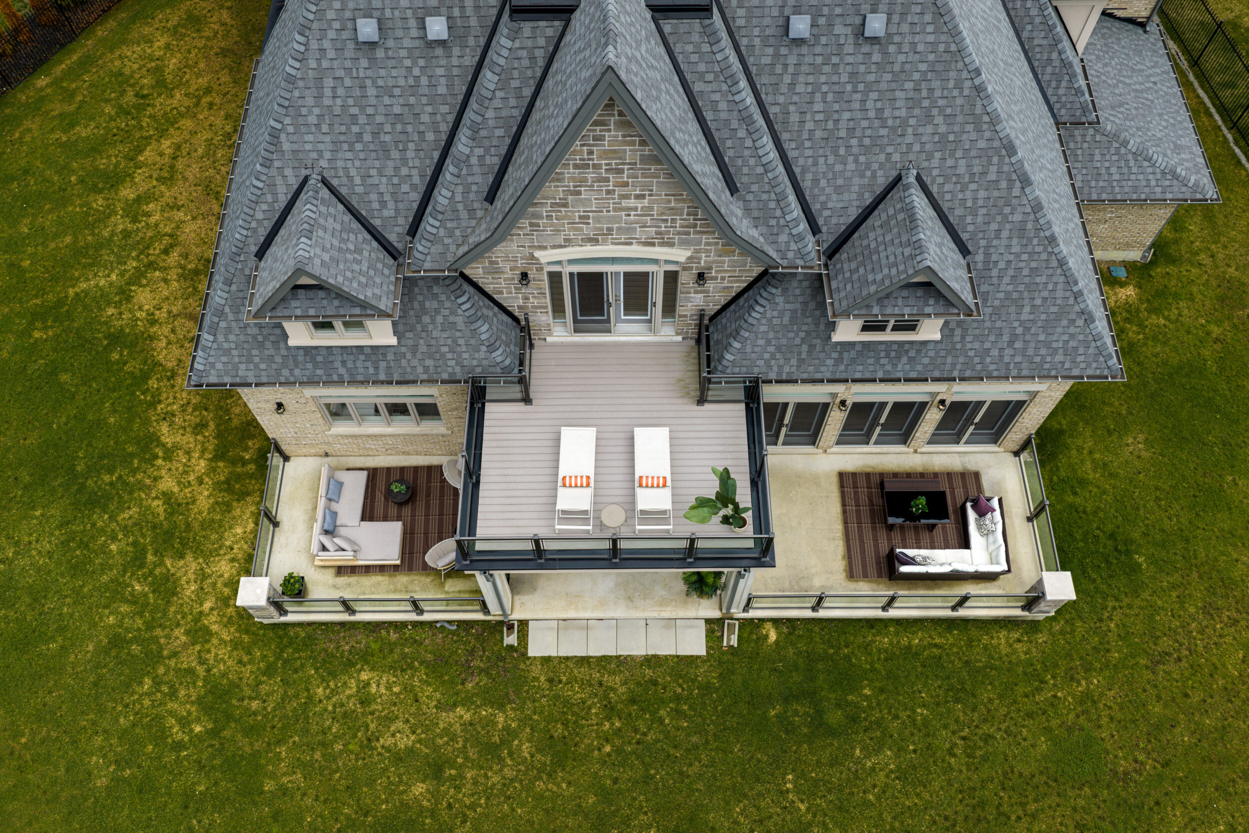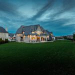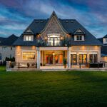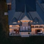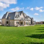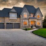 The exterior is pure stone, the kind that was not chosen, but earned and communicates permanence before you’ve touched the door. A tri-car garage with parking for four vehicles sits behind a herringbone paver driveway long enough to accommodate the collection. The standing-seam metal detail at the entry portico echoes the roofline’s charcoal accents above – the quiet signature of a builder who was showing off.