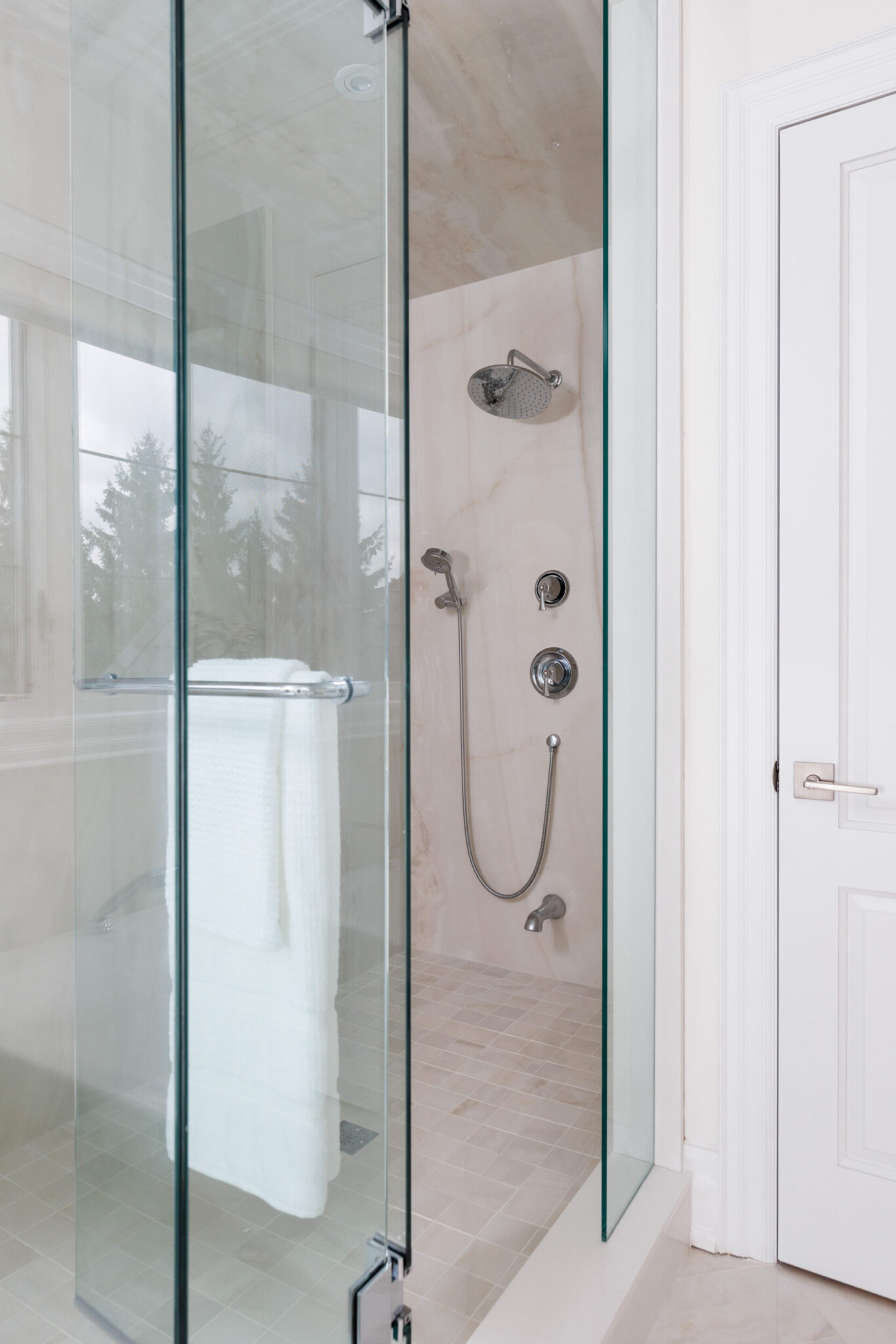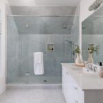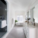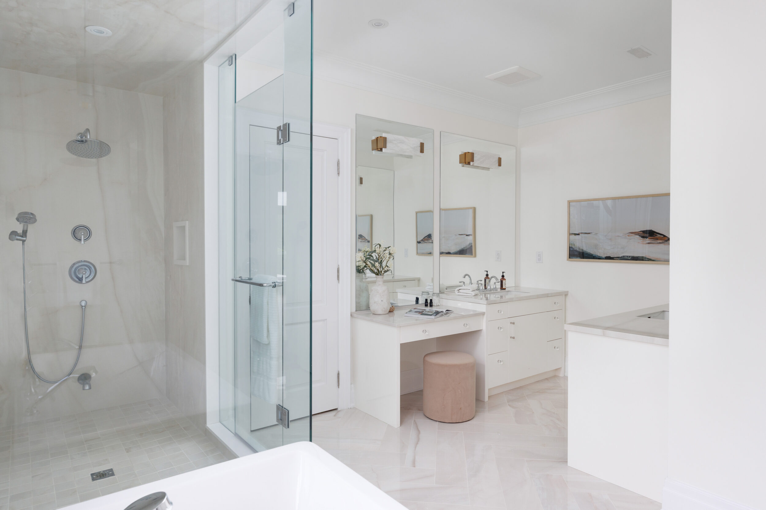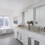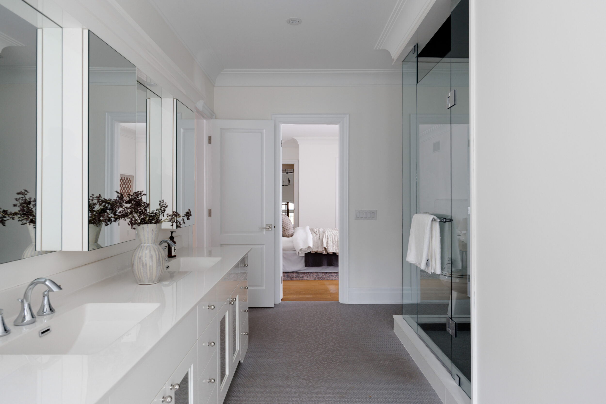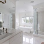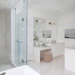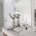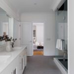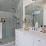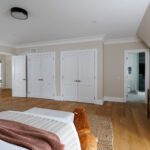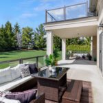 The primary suite occupies its own wing on the upper level and feels less like a bedroom than a private residence within the house. A balcony overlooks the course. The walk-in closet is a proper dressing room, the kind where the lighting is right and the question of what to wear feels like a pleasure rather than a problem. The ensuite does not compromise.