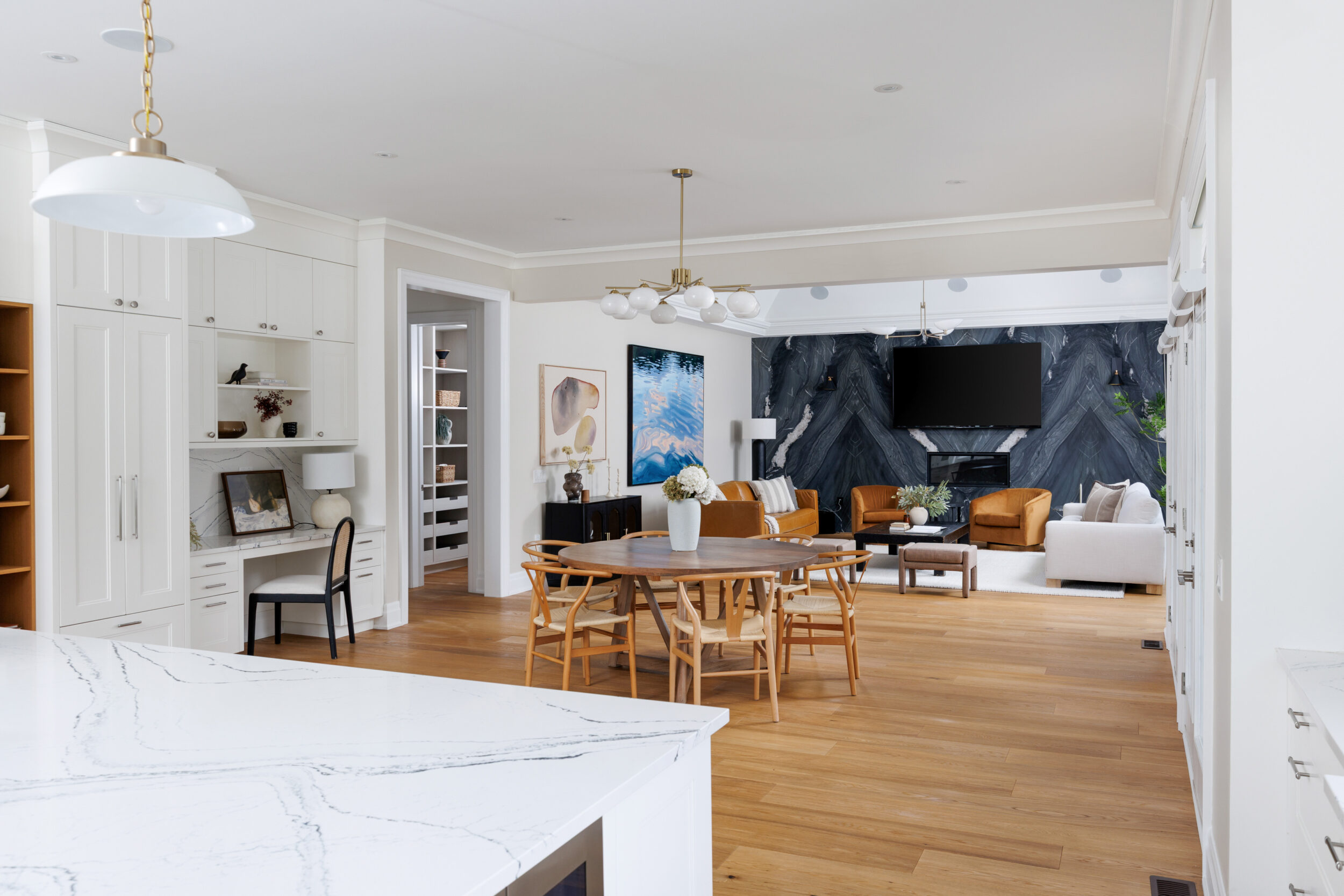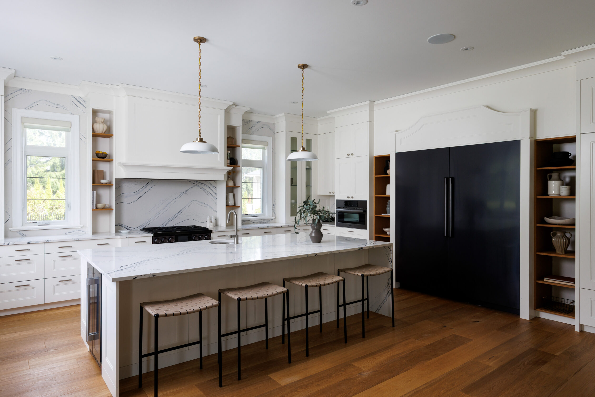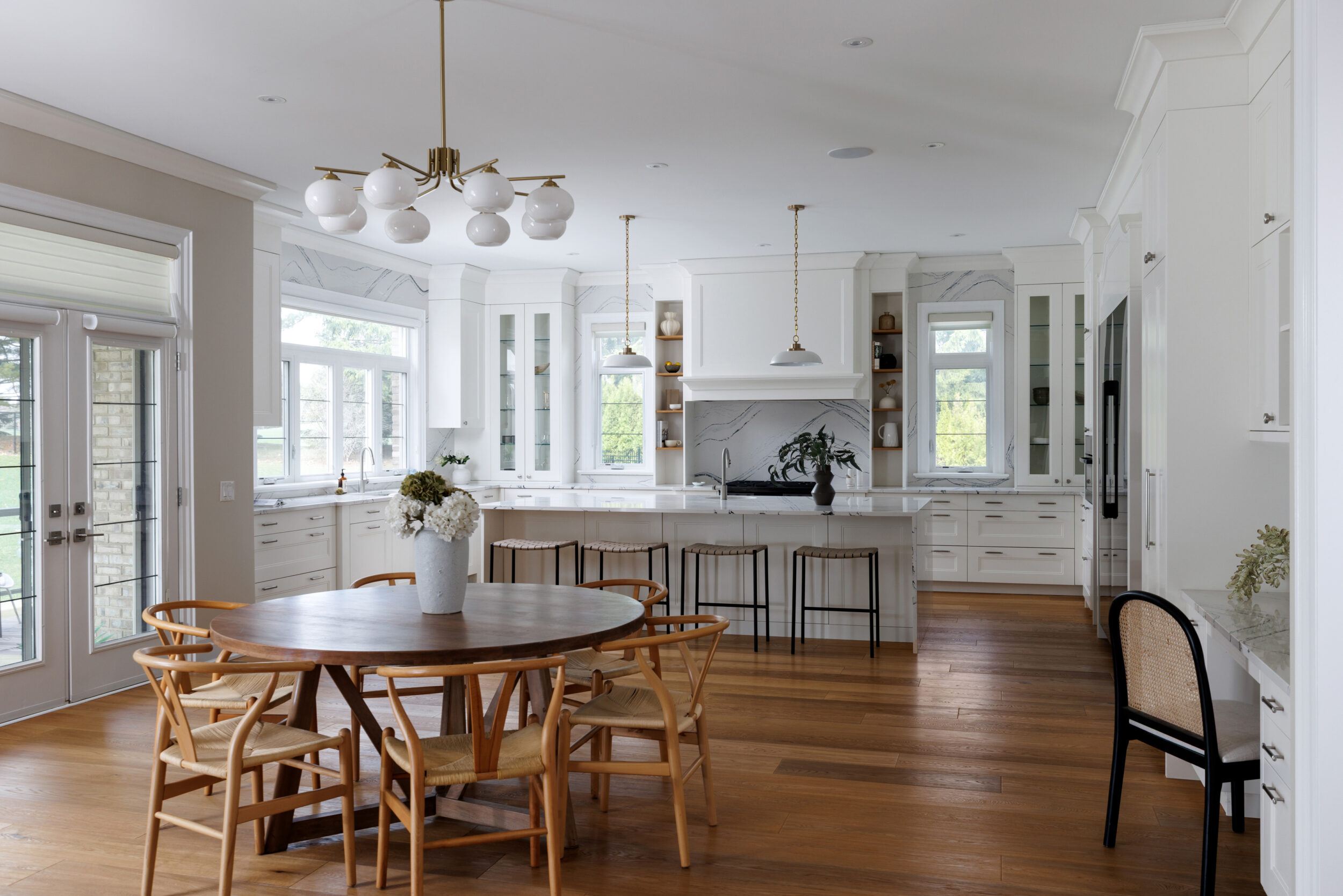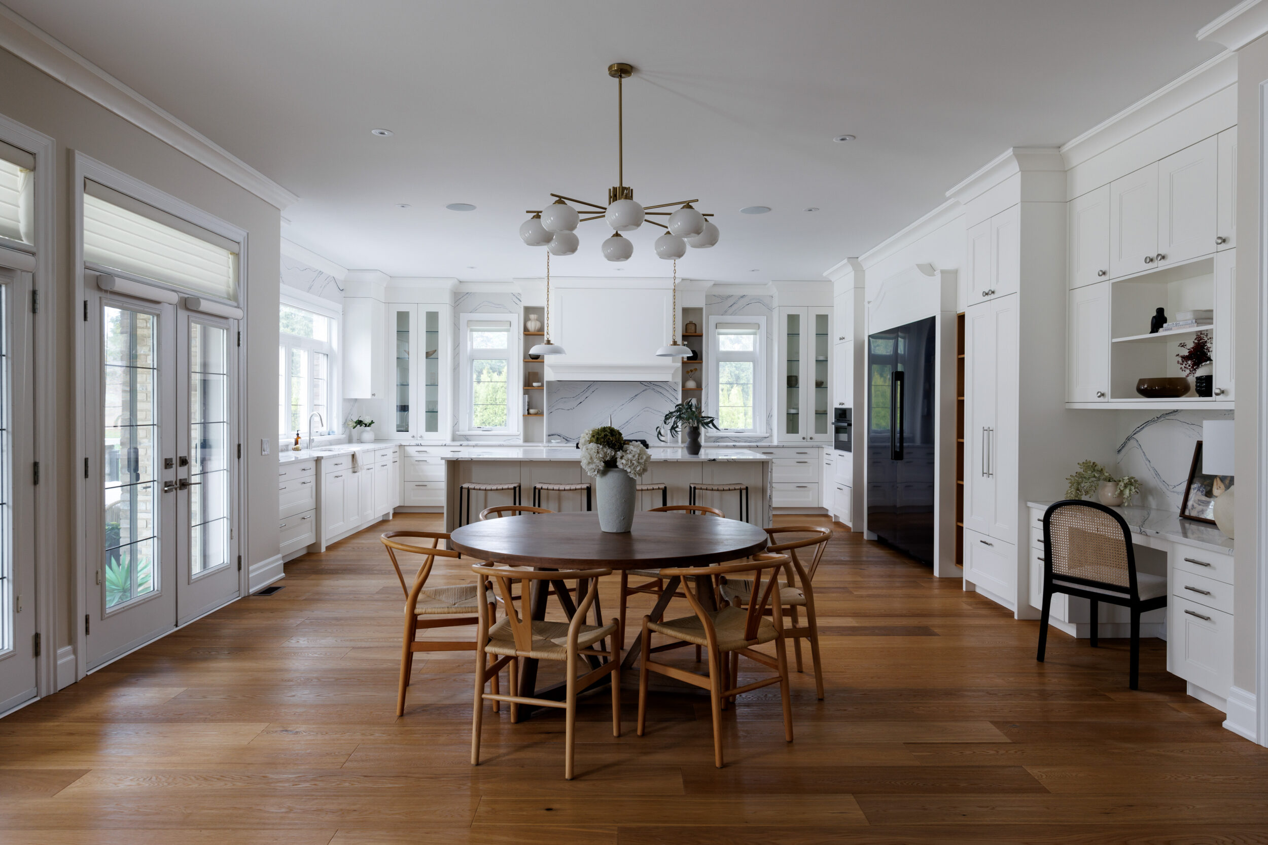 The kitchen is a proper working kitchen, not a showroom. White shaker custom Downsview cabinetry to the ceiling. A waterfall island in book-matched Cambria quartz with a prep sink and seating that invites people to stay. A professional-grade Dacor gas range with commercial grates and a Dacor refrigerator, for the person who knows what that means. Around it, the room opens into something more. An informal dining area at the centre built for everyday family dinners, games nights, and the kind of conversations that go longer than planned. A generous pantry. An office nook for the days when you just need a corner and a coffee. Every house has a kitchen. Very few have a room like this one.