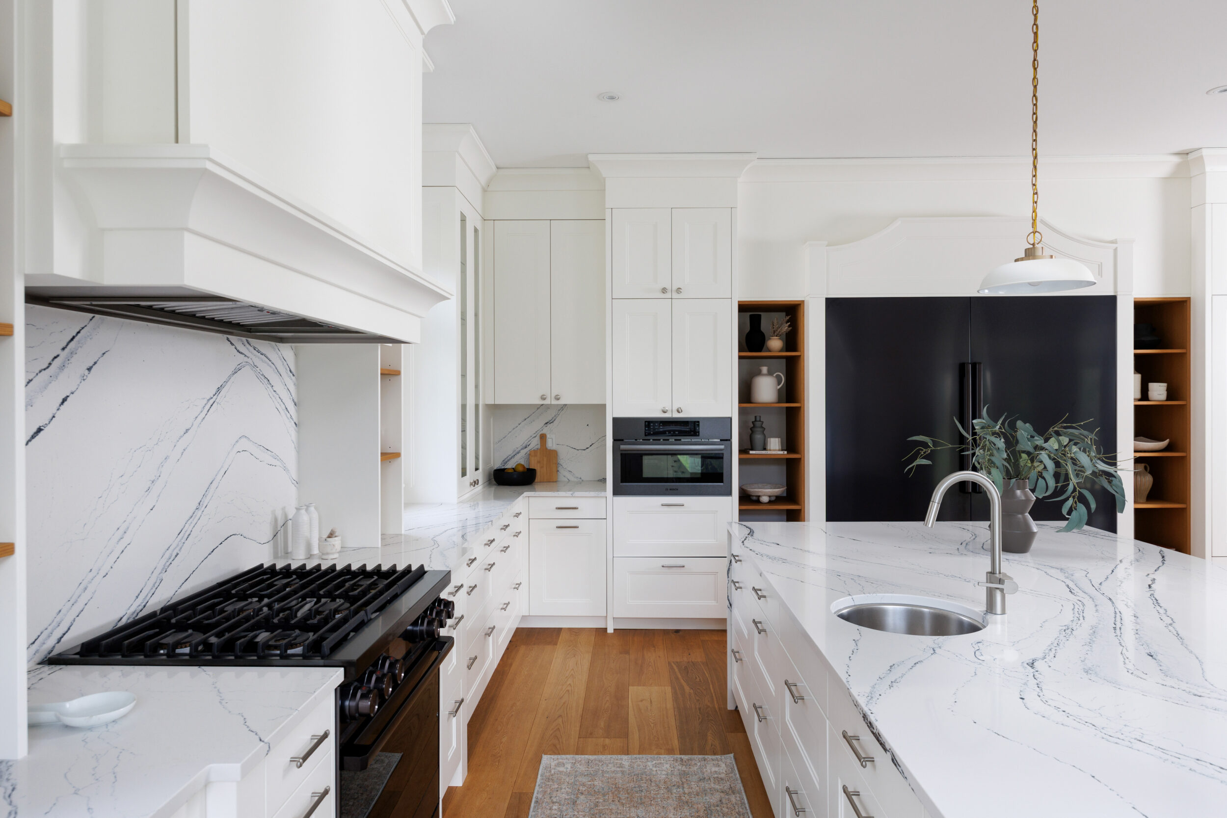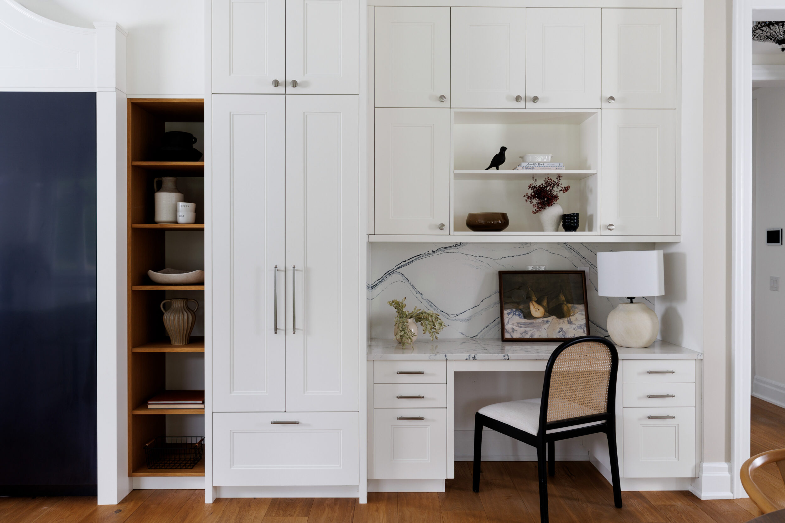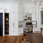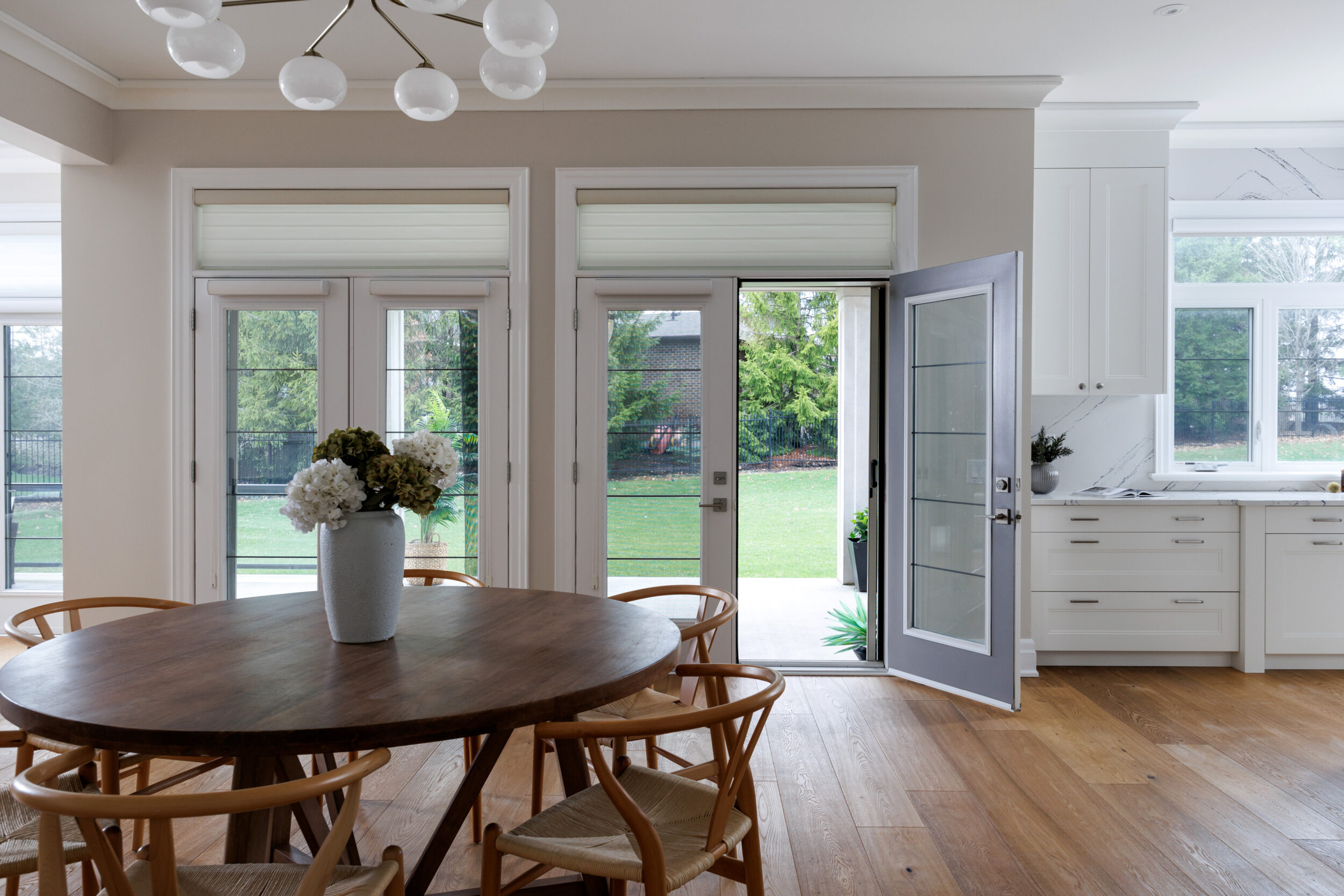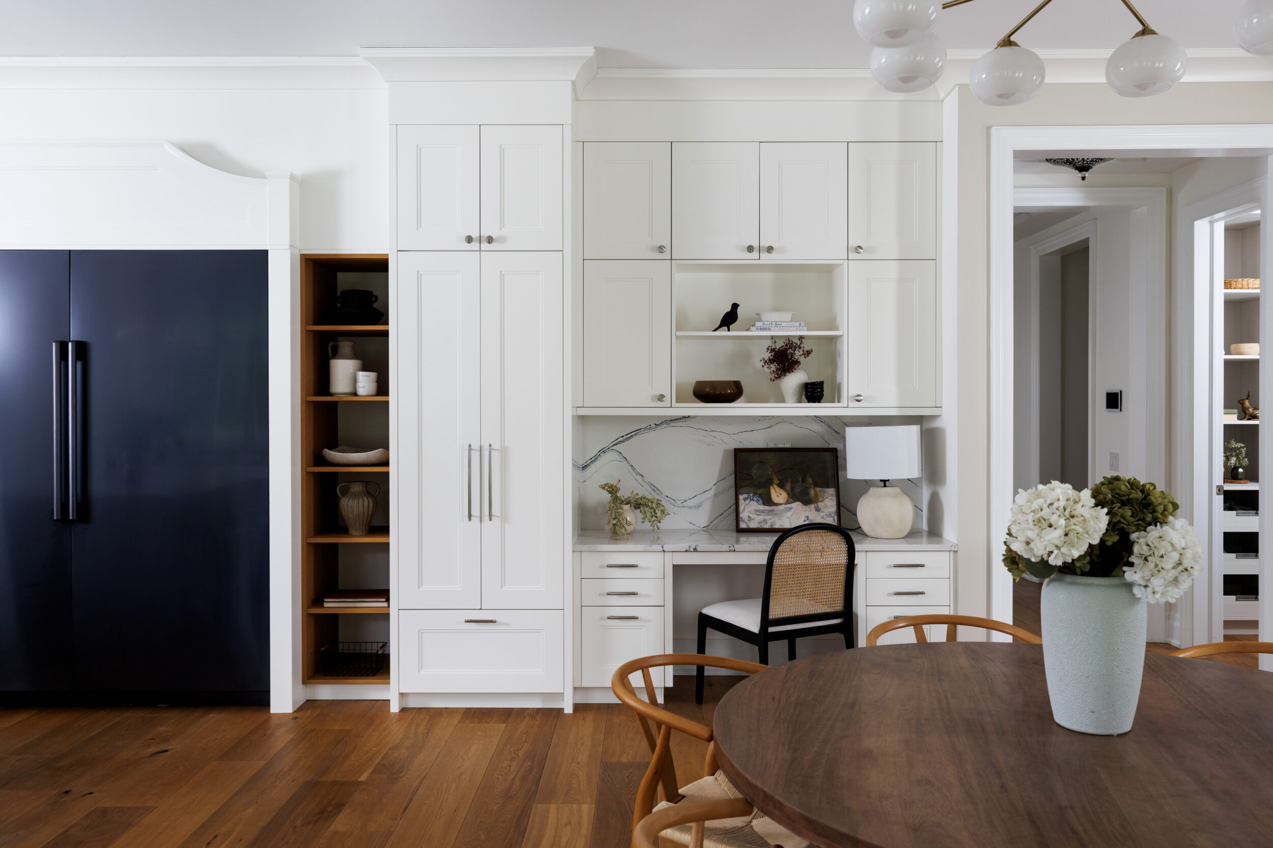 The kitchen is a proper working kitchen, not a showroom. White shaker custom Downsview cabinetry to the ceiling. A waterfall island in book-matched Cambria quartz with a prep sink and seating that invites people to stay. A professional-grade Dacor gas range with commercial grates and a Dacor refrigerator, for the person who knows what that means. Around it, the room opens into something more. An informal dining area at the centre built for everyday family dinners, games nights, and the kind of conversations that go longer than planned. A generous pantry. An office nook for the days when you just need a corner and a coffee. Every house has a kitchen. Very few have a room like this one.