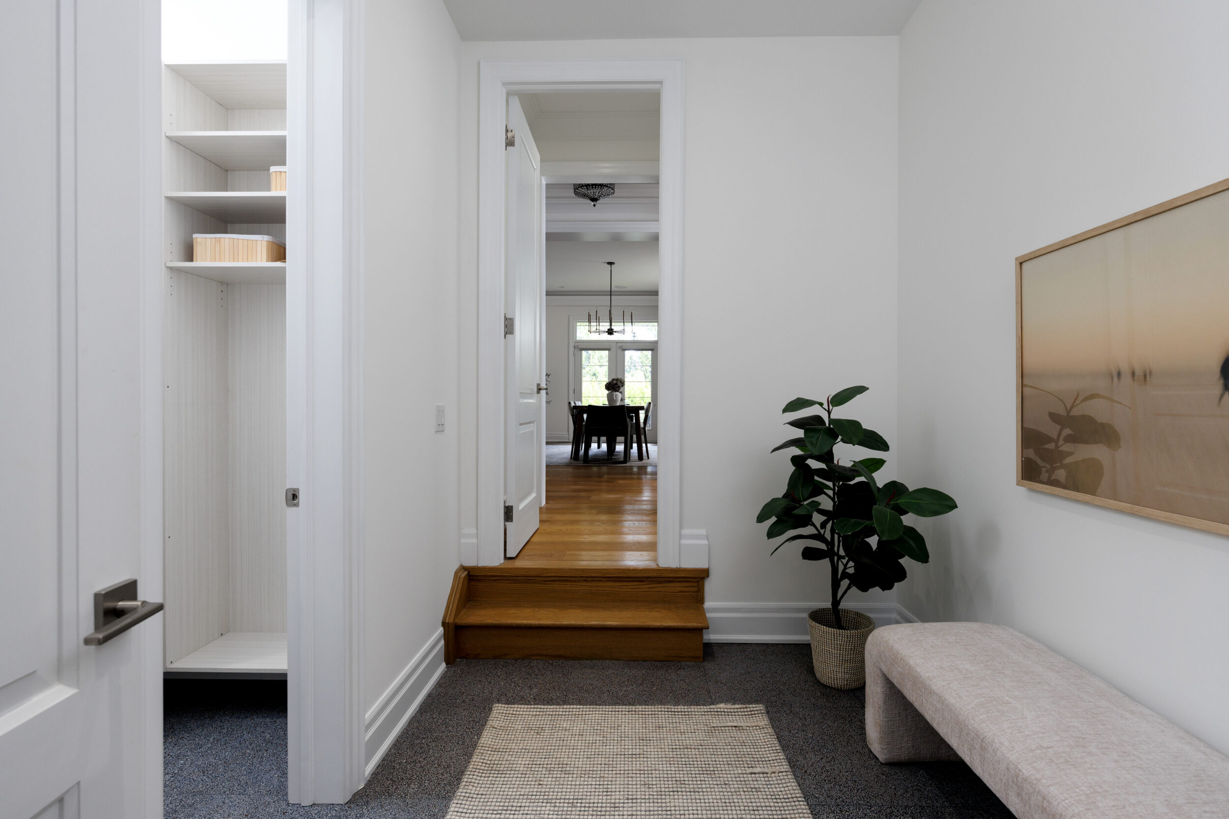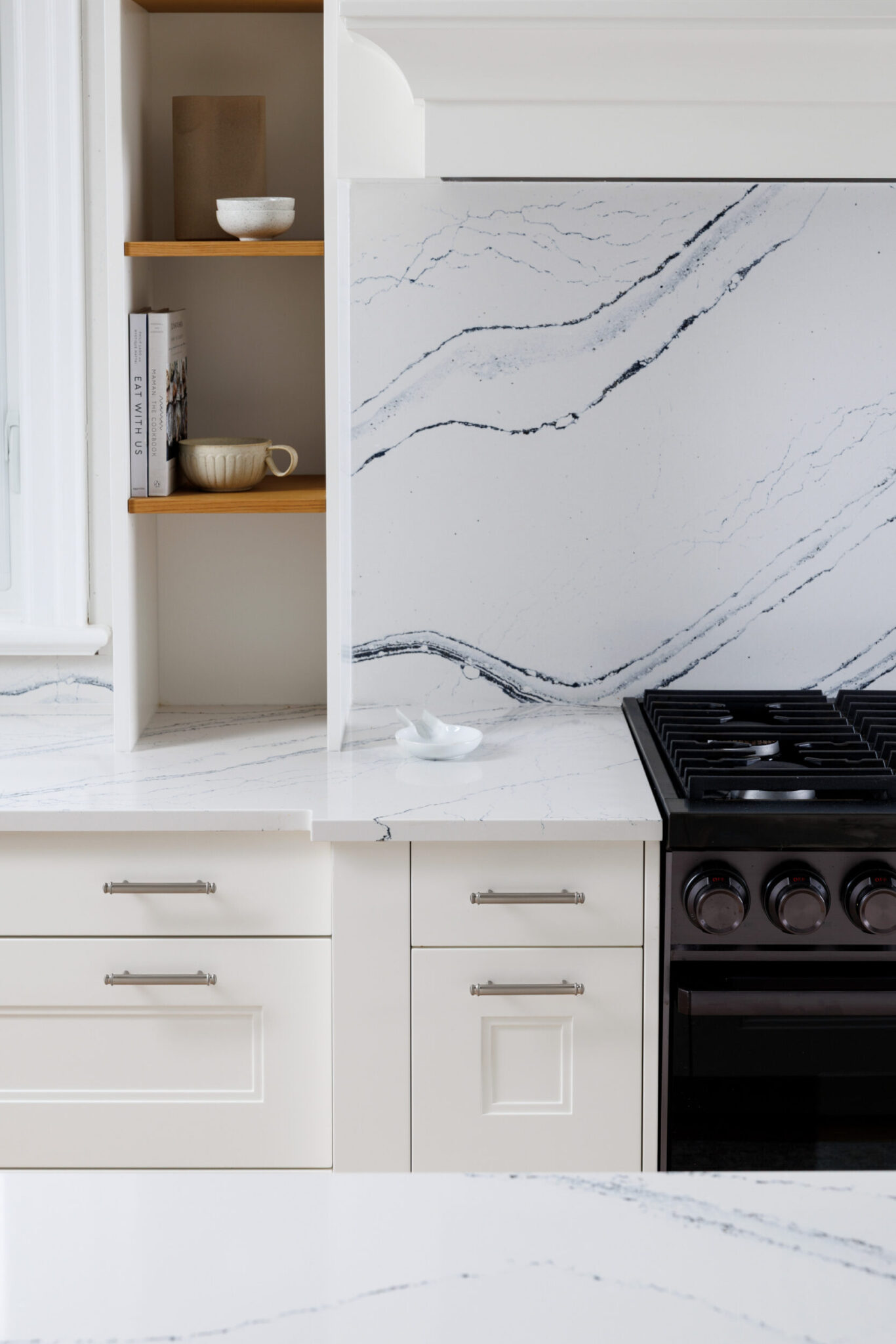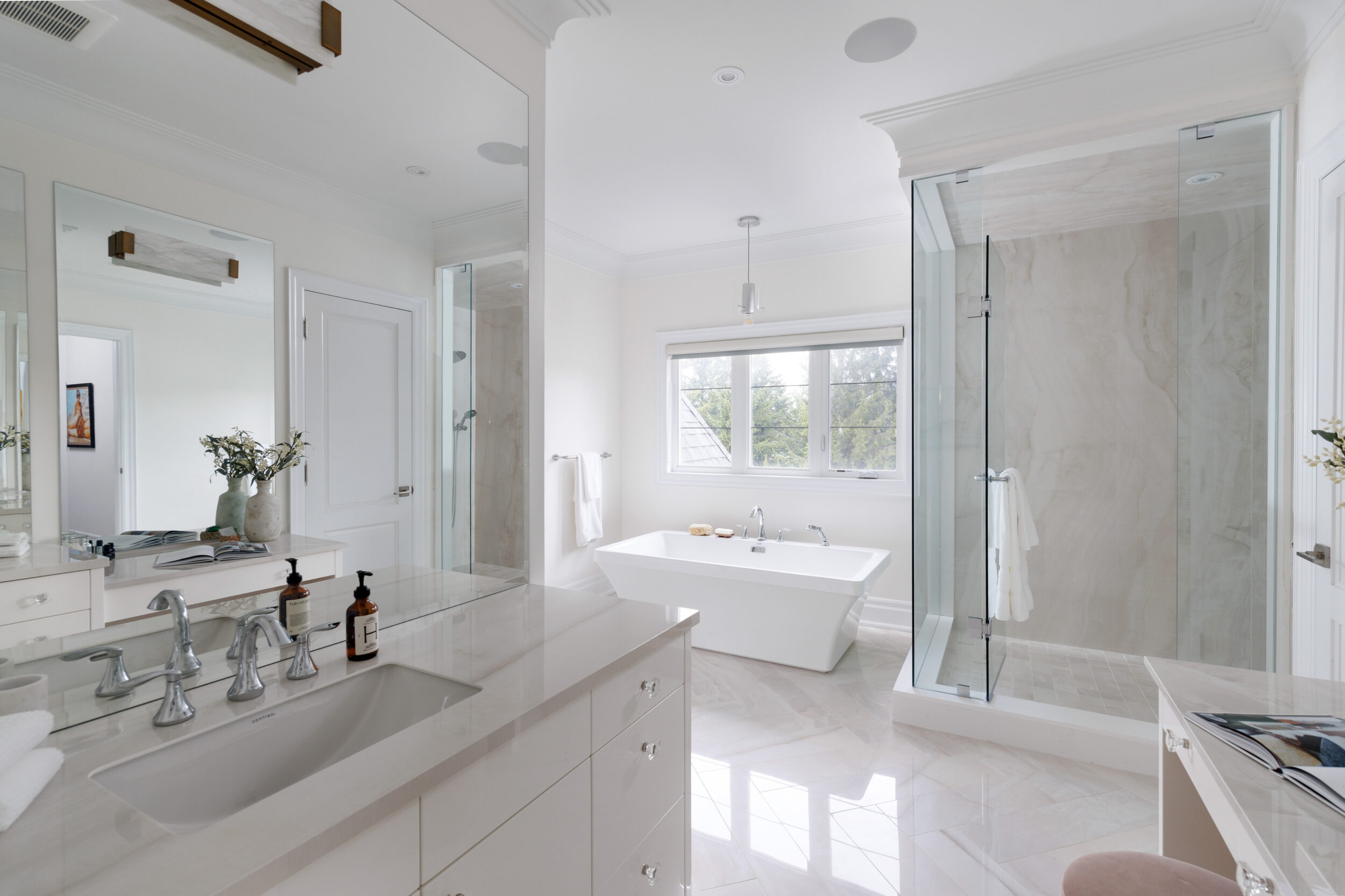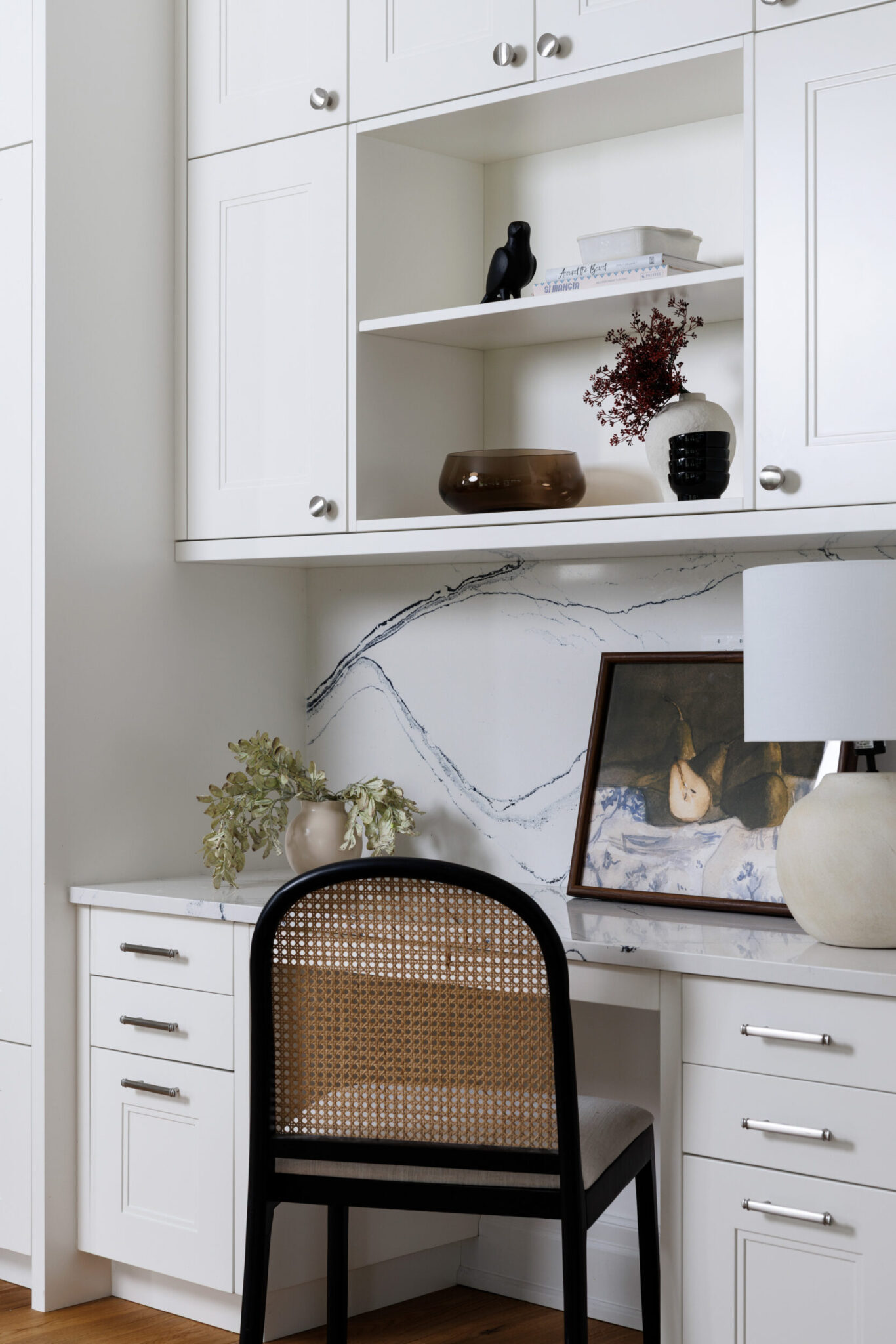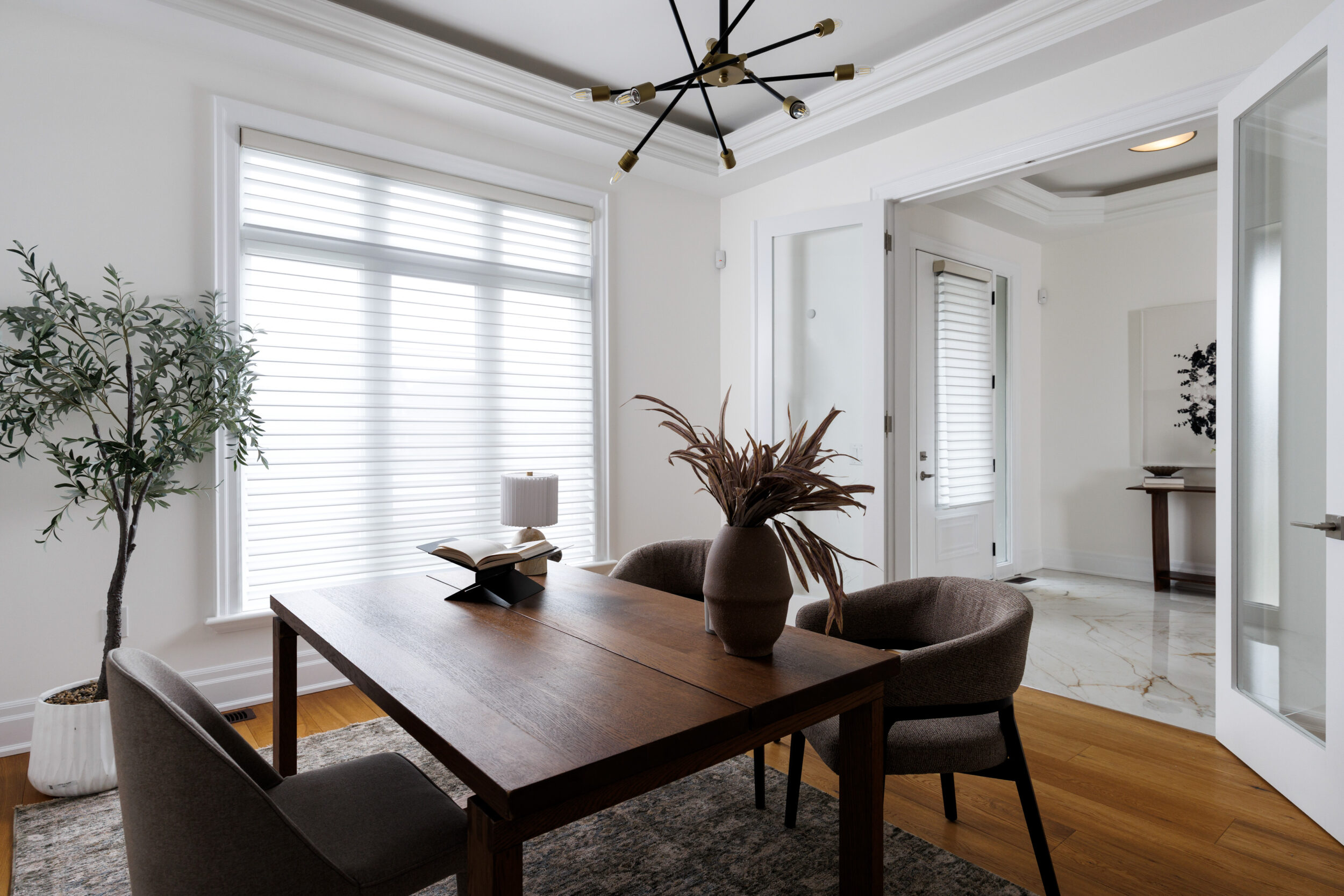 The kitchen is a proper working kitchen, not a showroom. White shaker custom Downsview cabinetry to the ceiling. A waterfall island in book-matched Cambria quartz with a prep sink and seating that invites people to stay. A professional-grade Dacor gas range with commercial grates and a Dacor refrigerator, for the person who knows what that means. Around it, the room opens into something more. An informal dining area at the centre built for everyday family dinners, games nights, and the kind of conversations that go longer than planned. A generous pantry. An office nook for the days when you just need a corner and a coffee. Every house has a kitchen. Very few have a room like this one.