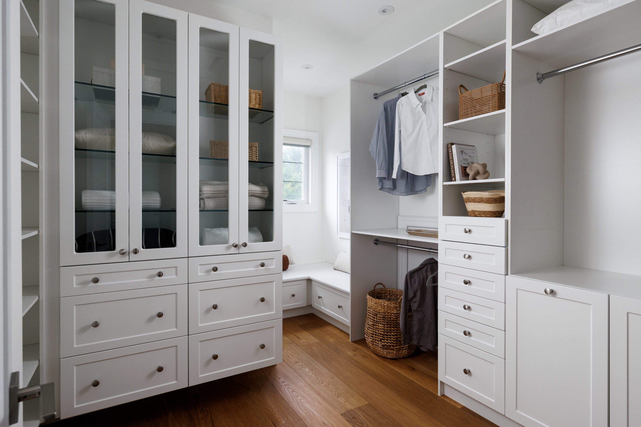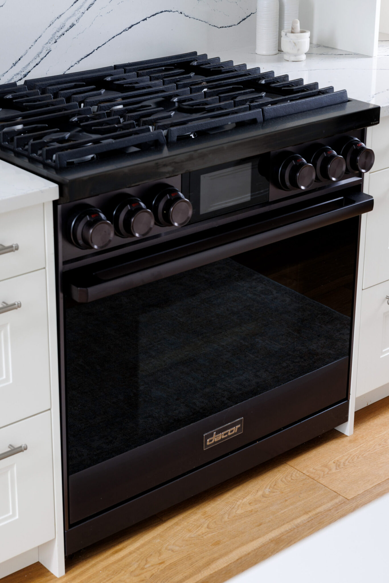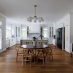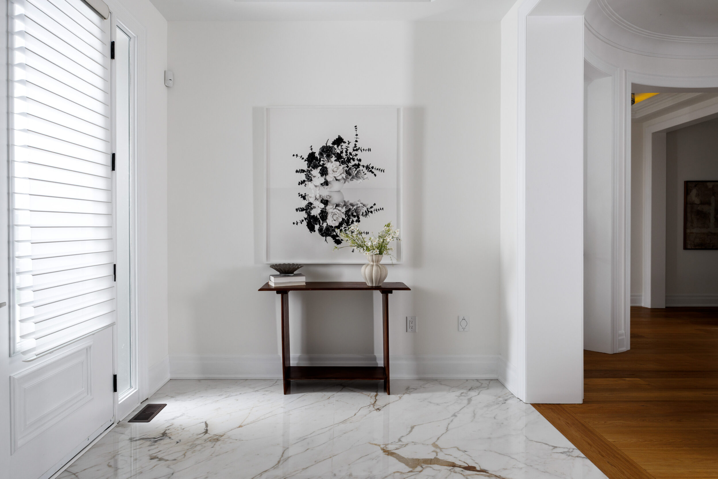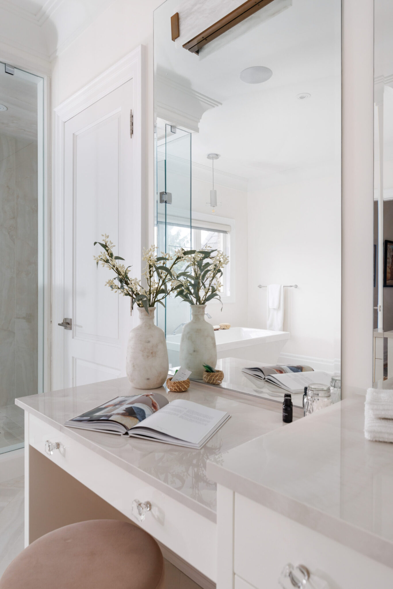 The kitchen is a proper working kitchen, not a showroom. White shaker custom Downsview cabinetry to the ceiling. A waterfall island in book-matched Cambria quartz with a prep sink and seating that invites people to stay. A professional-grade Dacor gas range with commercial grates and a Dacor refrigerator, for the person who knows what that means. Around it, the room opens into something more. An informal dining area at the centre built for everyday family dinners, games nights, and the kind of conversations that go longer than planned. A generous pantry. An office nook for the days when you just need a corner and a coffee. Every house has a kitchen. Very few have a room like this one.