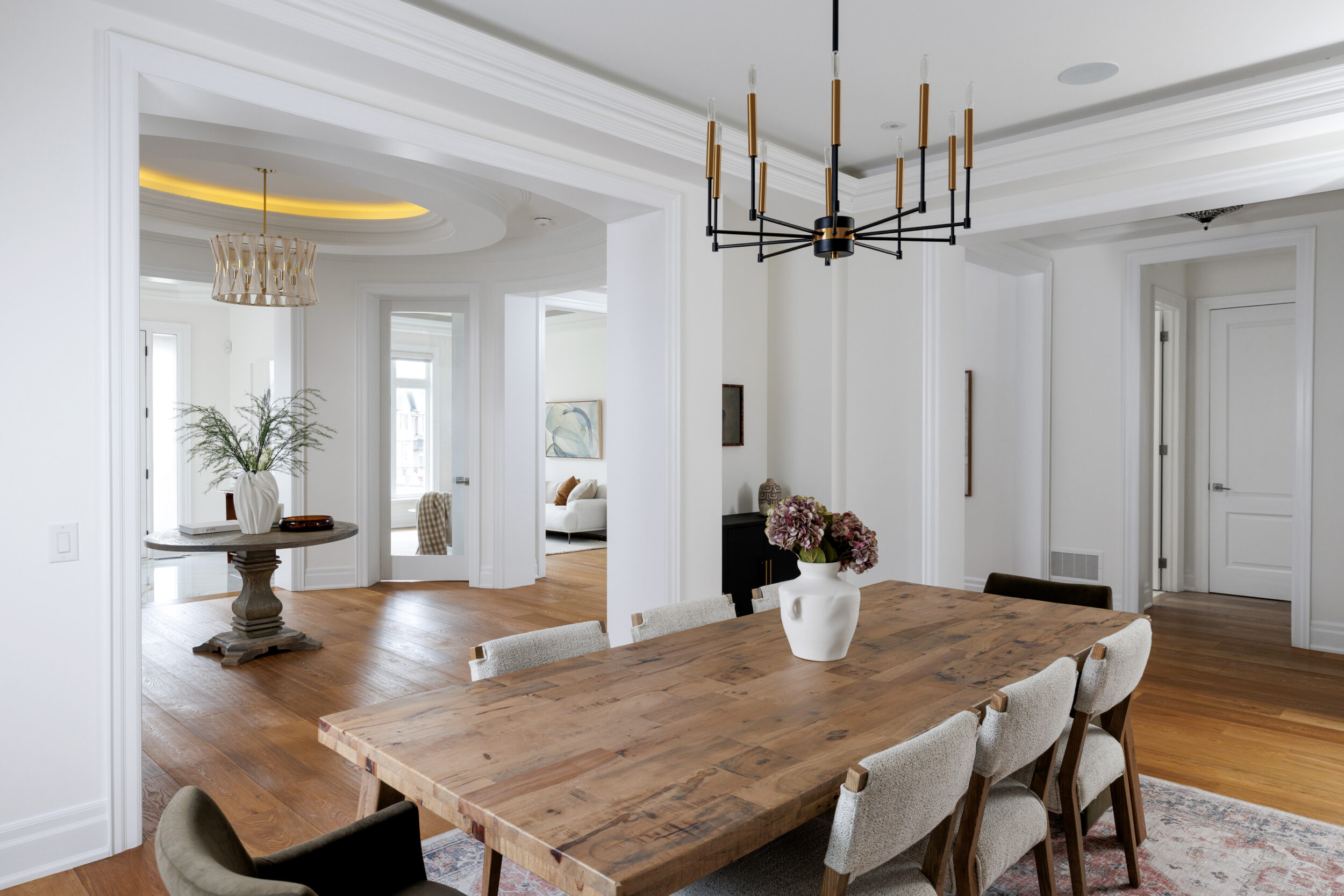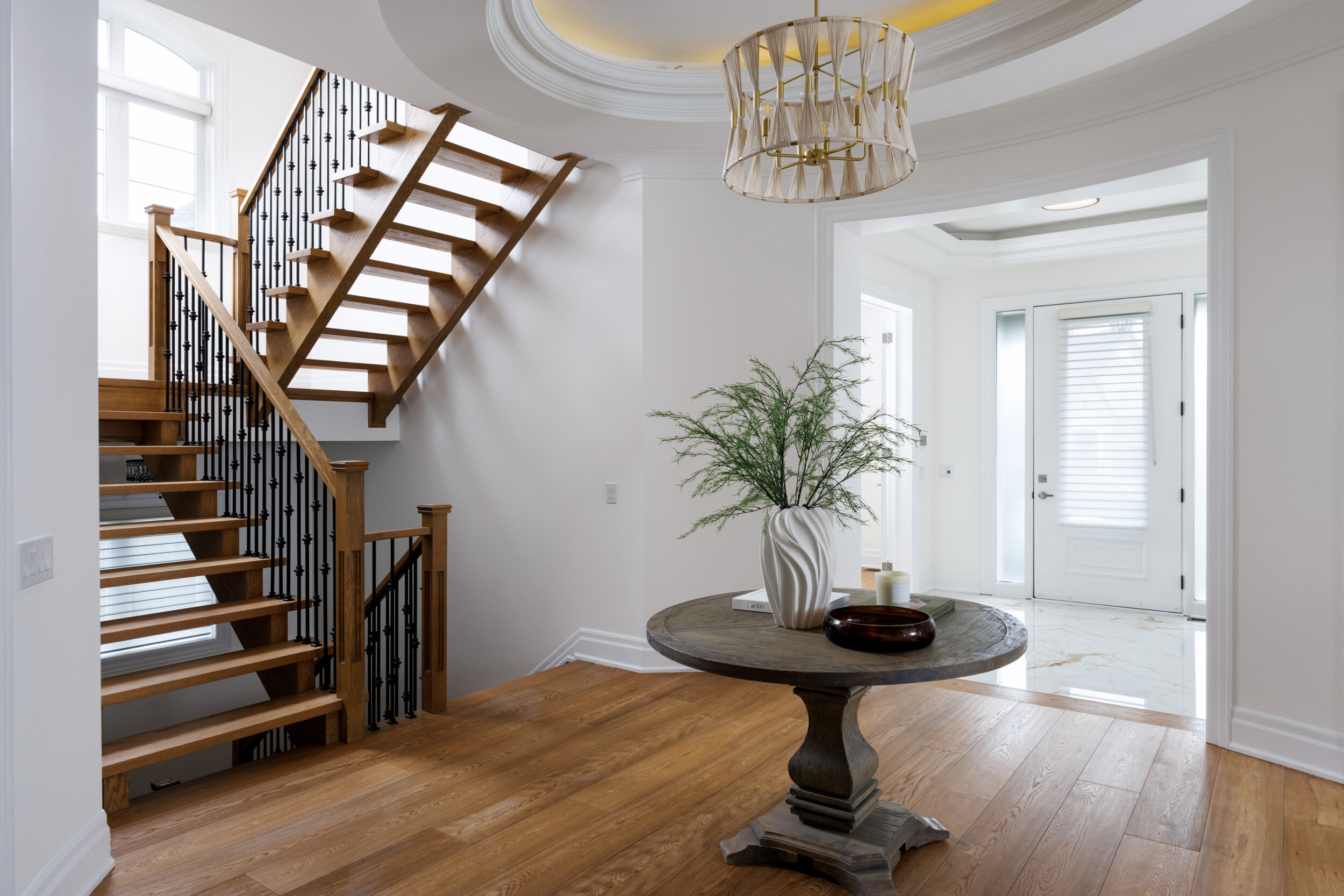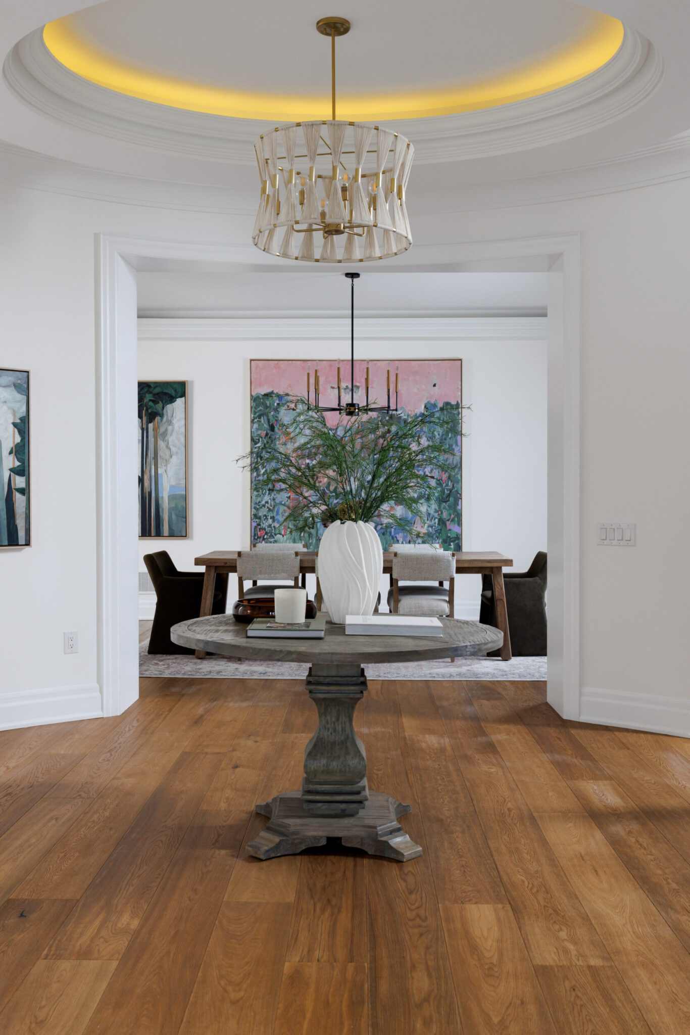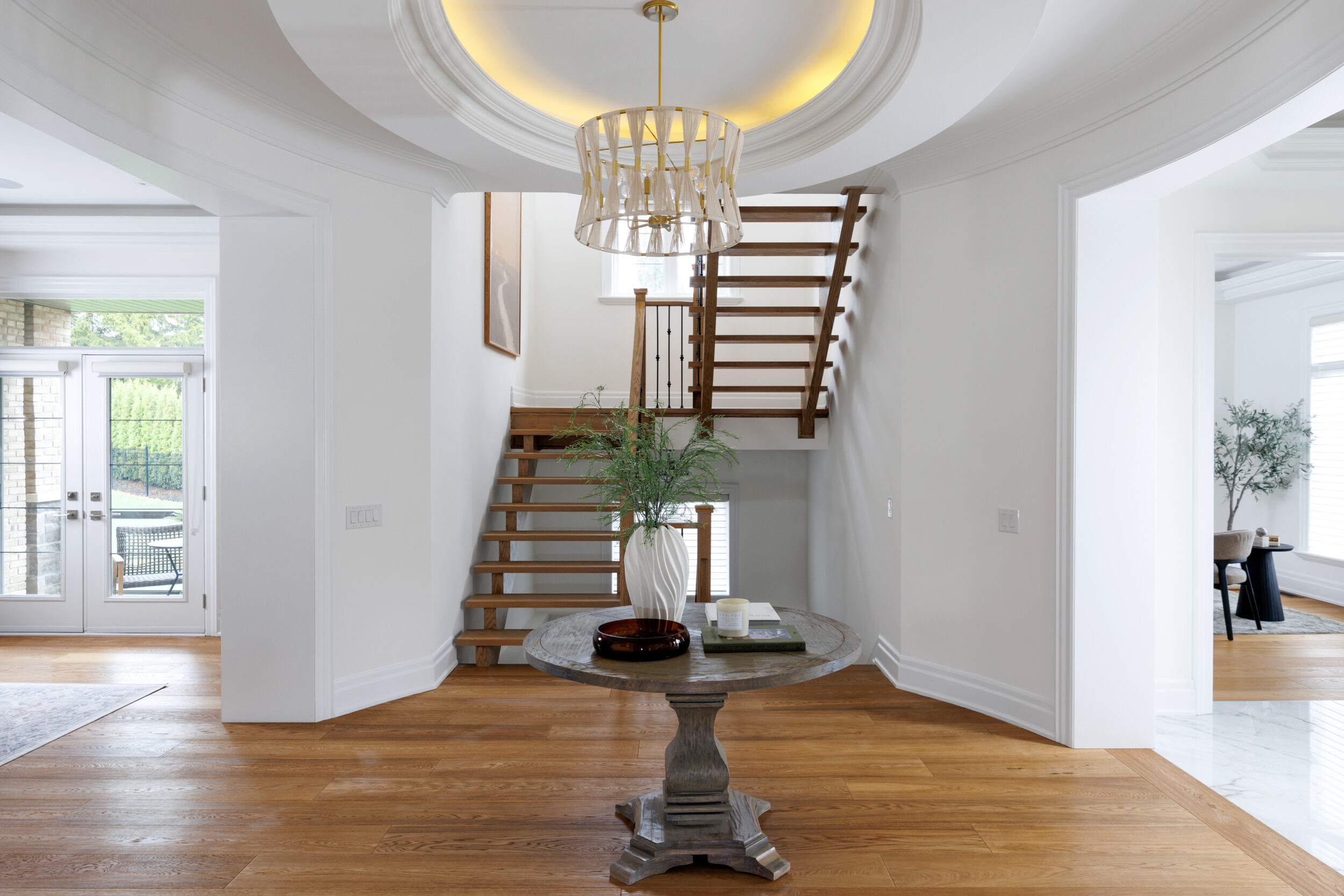 Inside, the circular foyer arrives first with a full rotunda, a coffered dome ceiling, warm oak floors running underfoot, and a chandelier scaled to the space rather than the budget. This is where you decide what kind of house you’ve walked into. The answer is: a serious one.