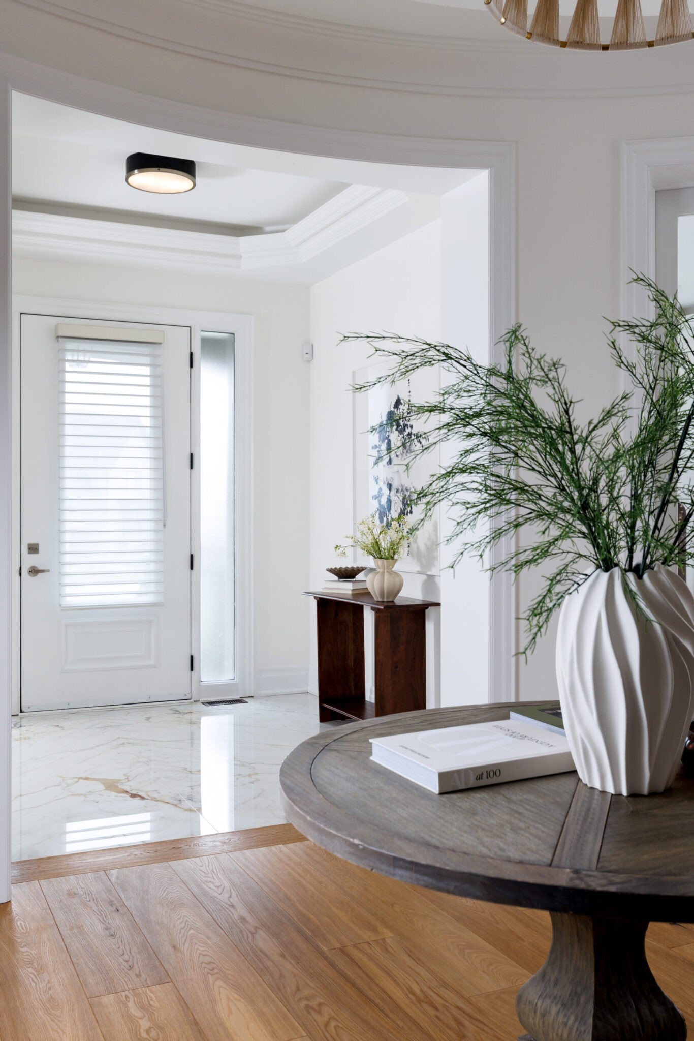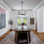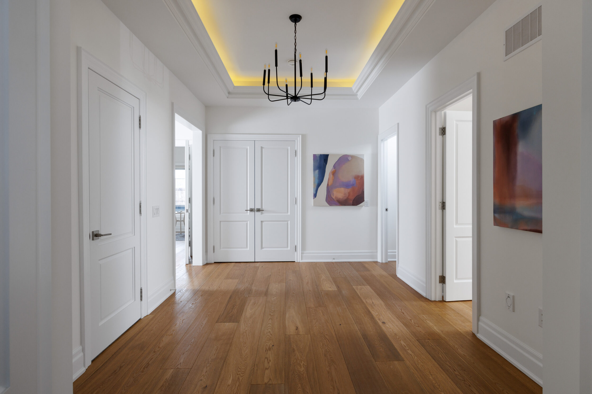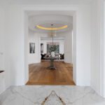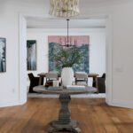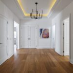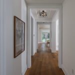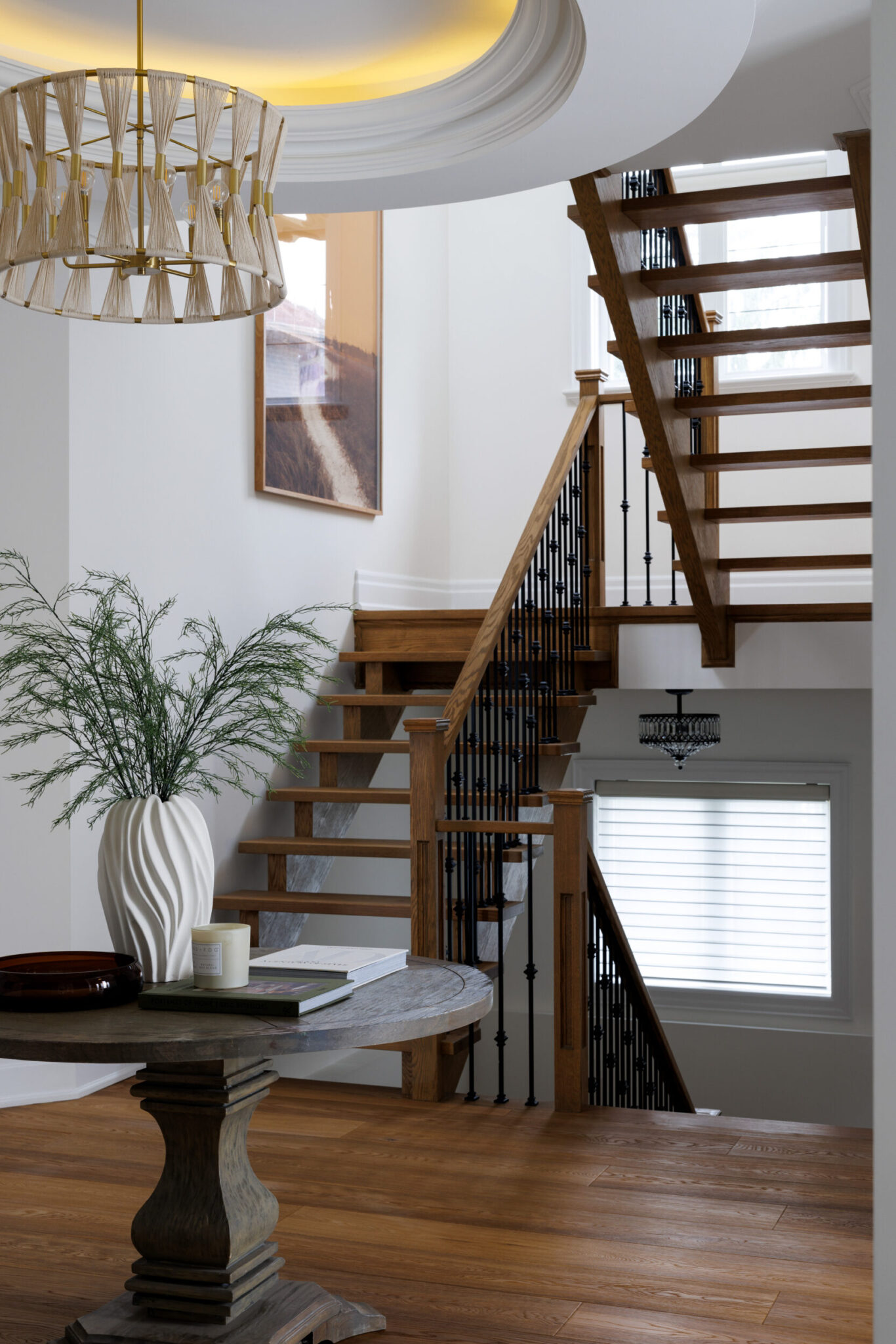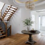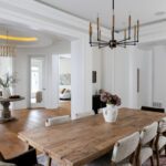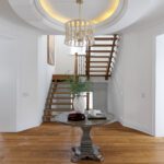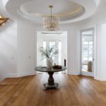 Inside, the circular foyer arrives first with a full rotunda, a coffered dome ceiling, warm oak floors running underfoot, and a chandelier scaled to the space rather than the budget. This is where you decide what kind of house you’ve walked into. The answer is: a serious one.