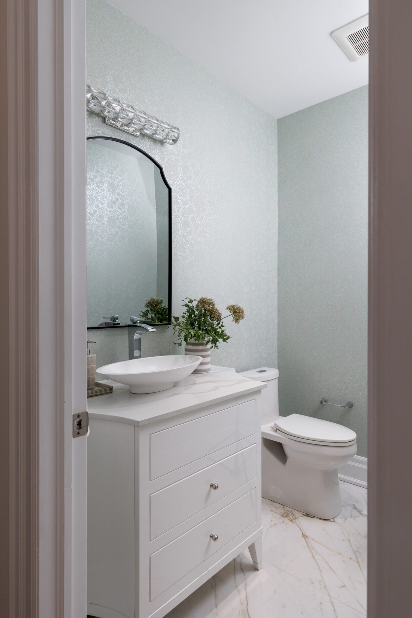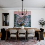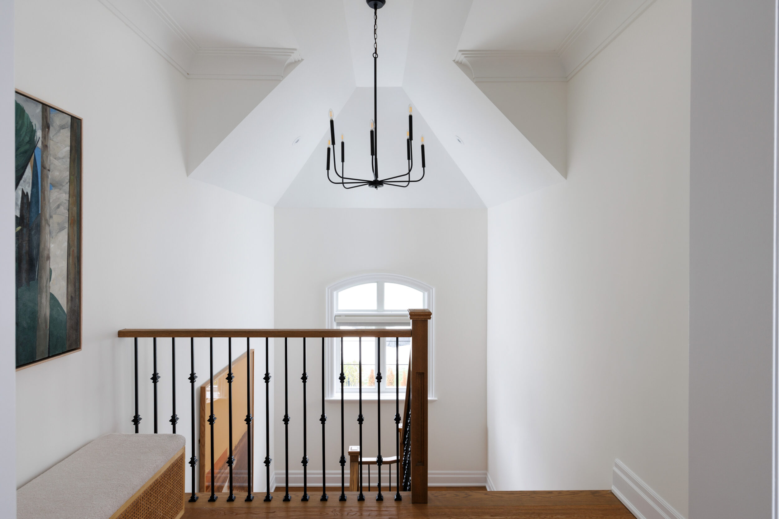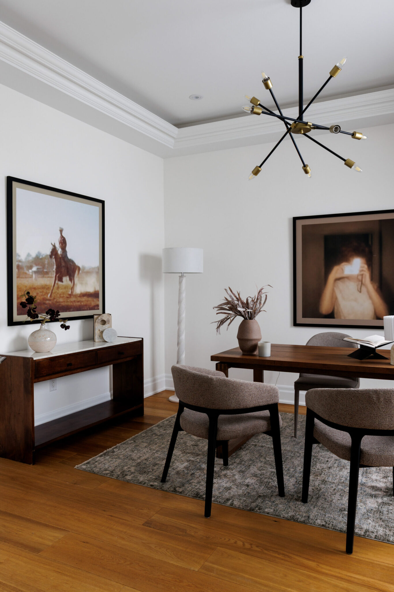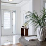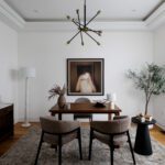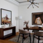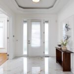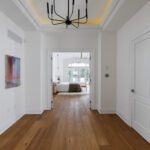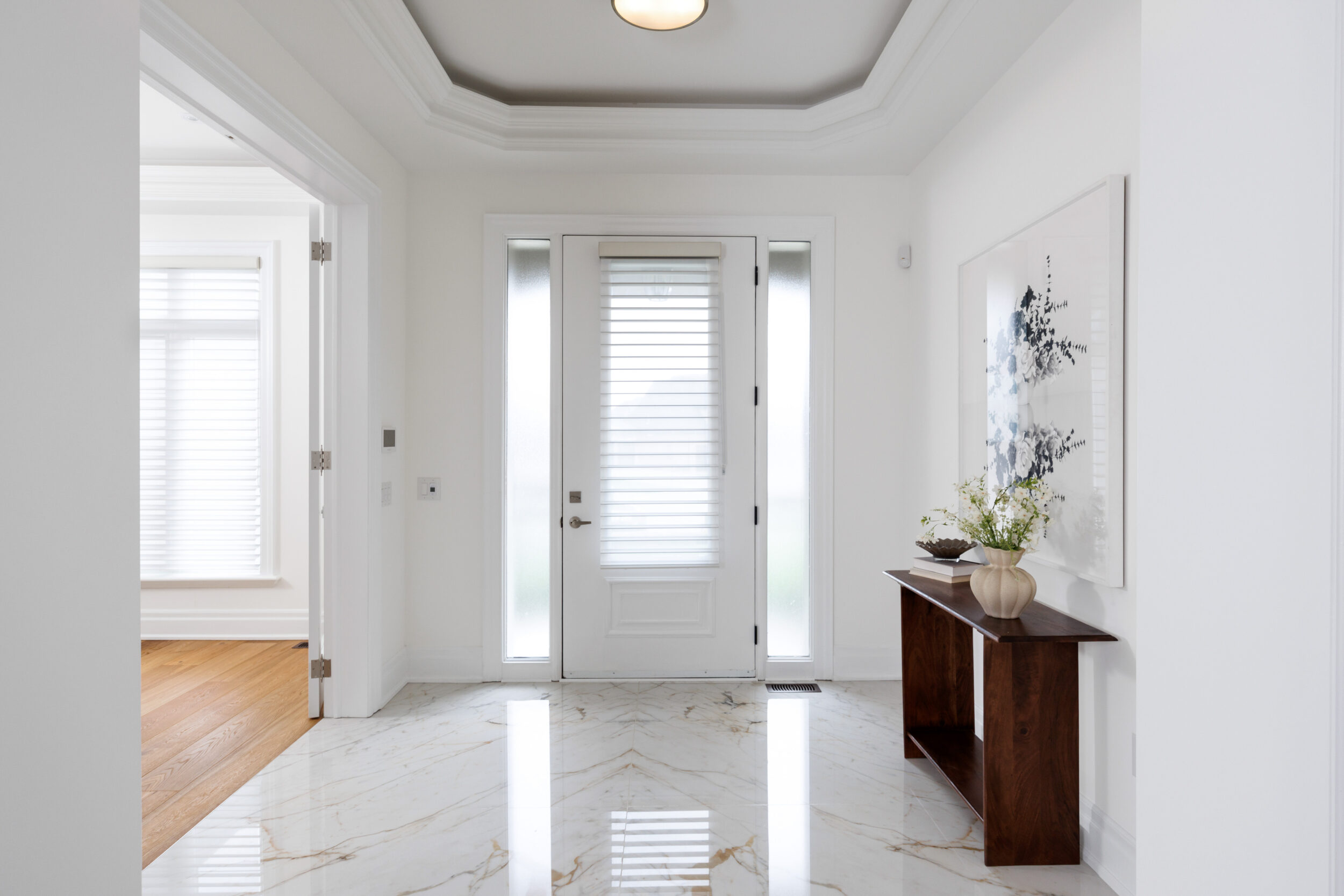 Inside, the circular foyer arrives first with a full rotunda, a coffered dome ceiling, warm oak floors running underfoot, and a chandelier scaled to the space rather than the budget. This is where you decide what kind of house you’ve walked into. The answer is: a serious one.