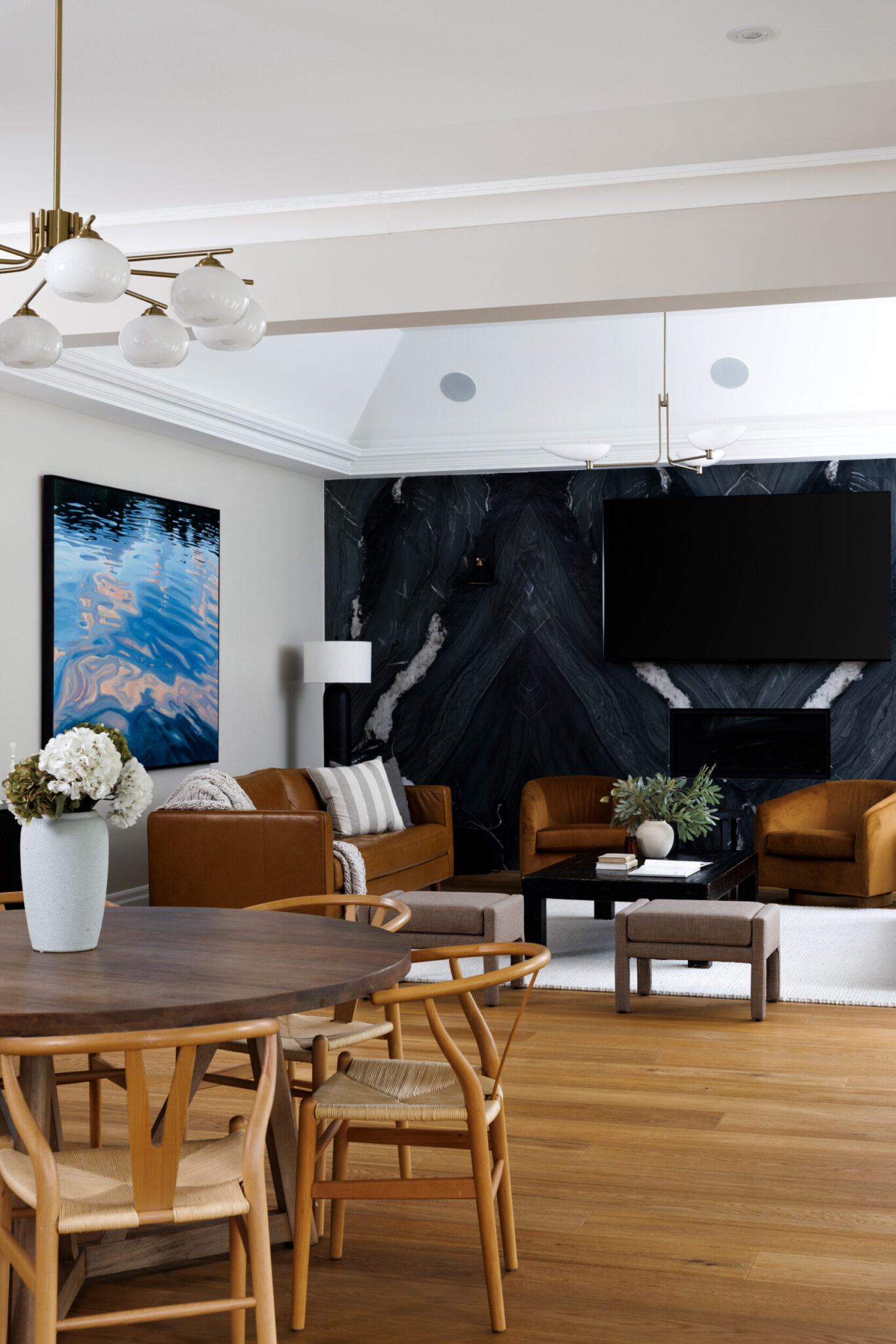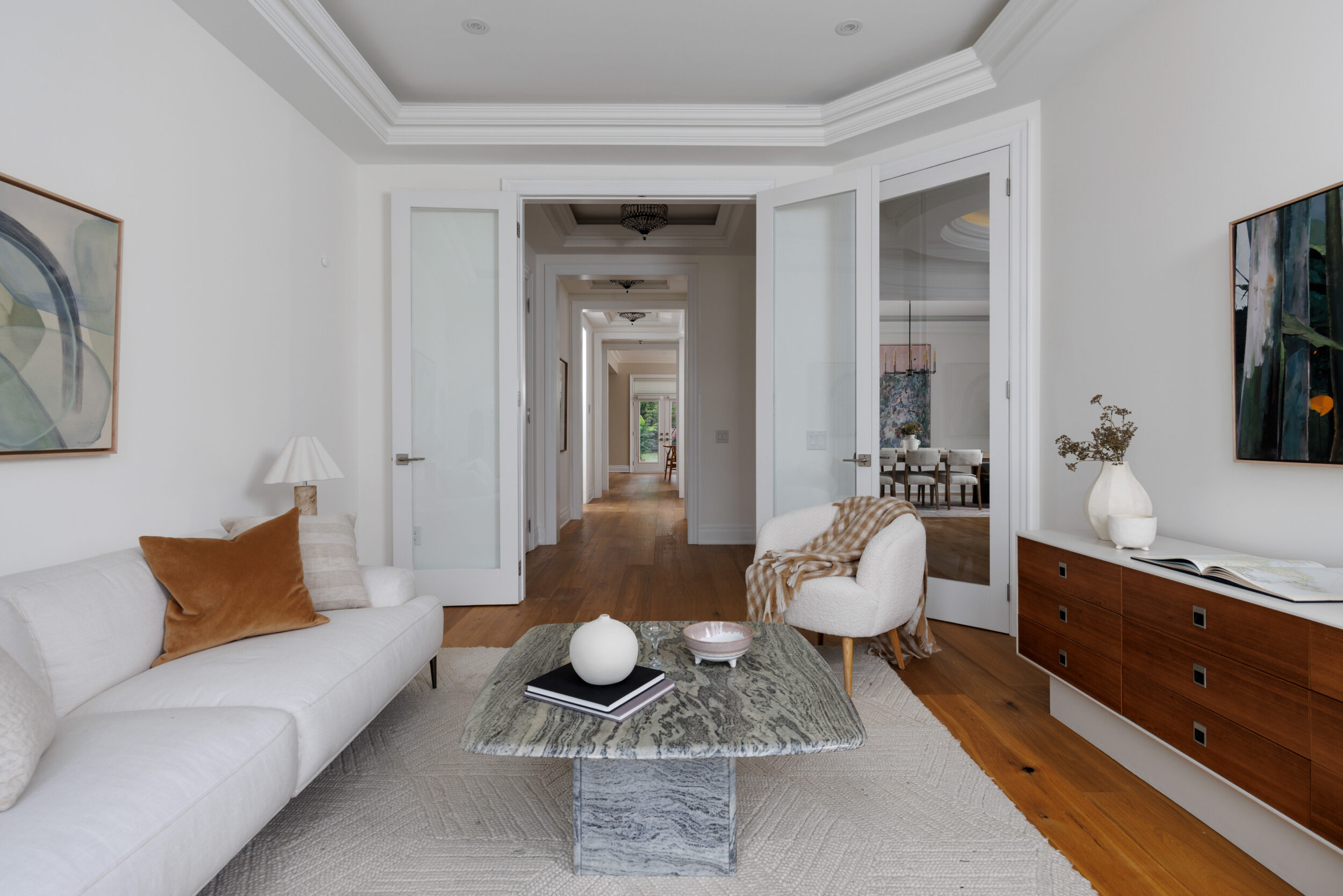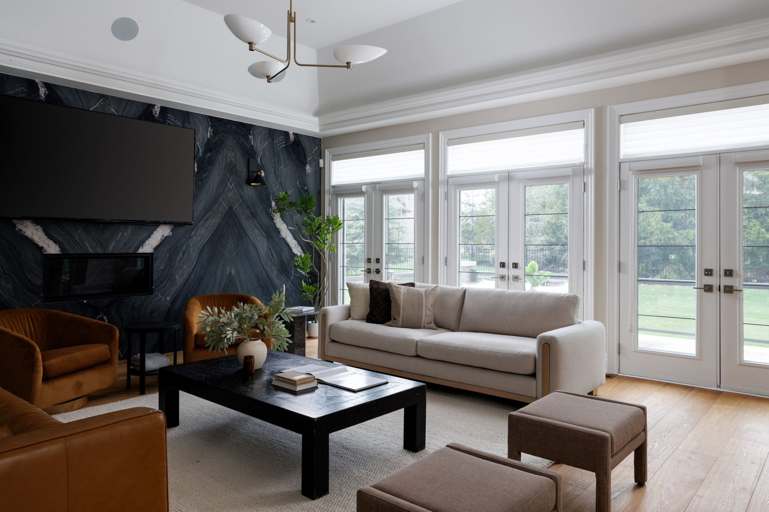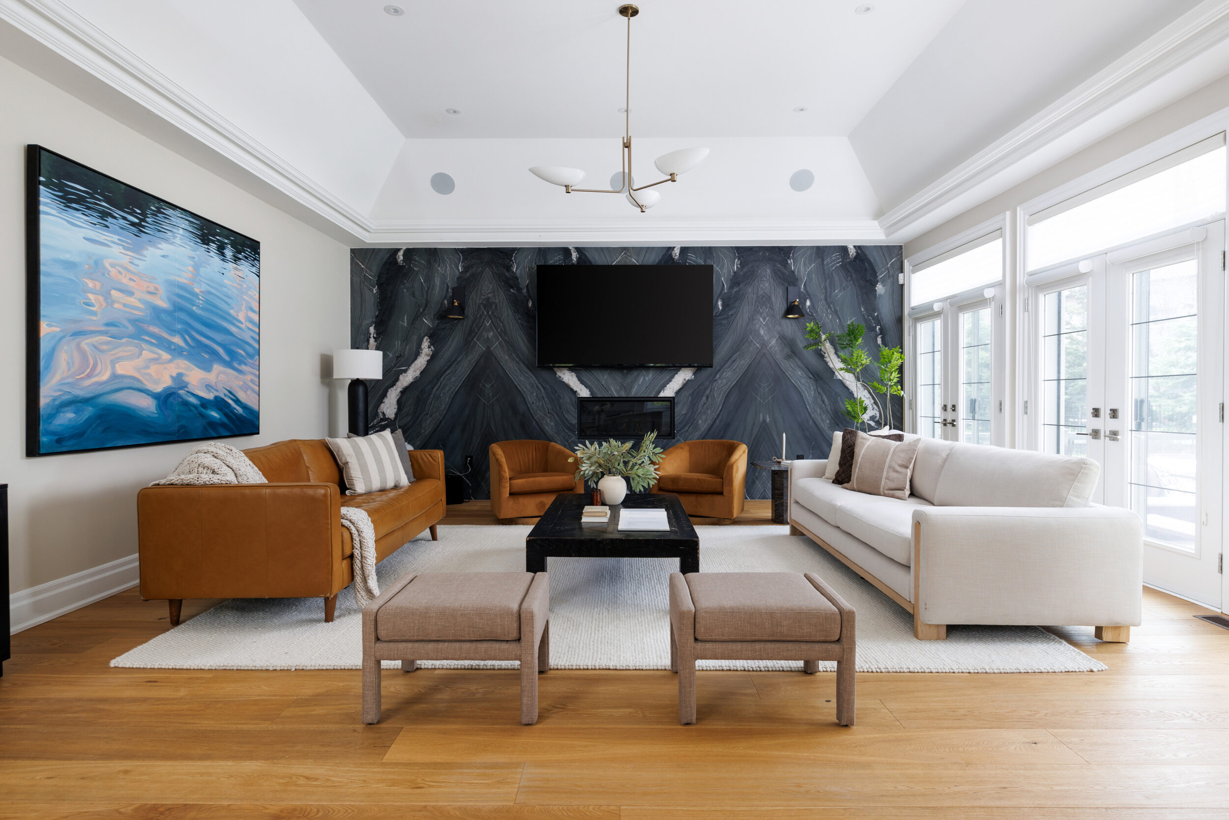 The principal rooms are generous without being cartoonish. A formal dining room with 10-foot trayed ceilings and art-gallery scale walls. A living room edited with the restraint of a well-travelled eye. A great room, anchored by a dramatic floor-to-ceiling stormy book-matched natural stone wall, the kind of feature that belongs in a design publication. Five sets of French doors along the West-facing wall open to the covered patio and the course beyond.