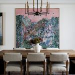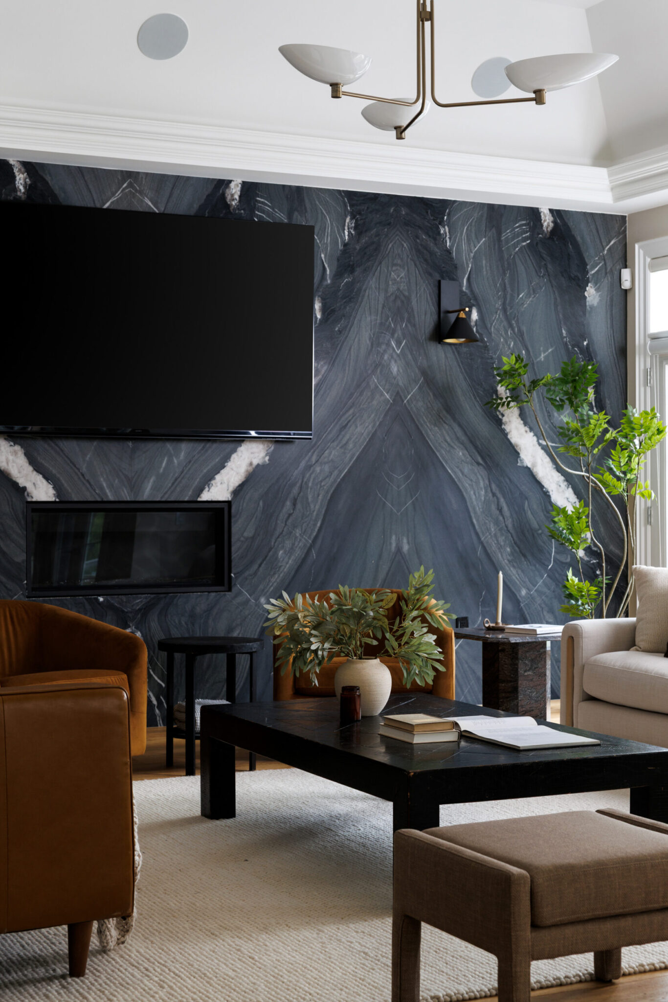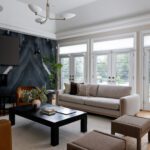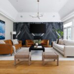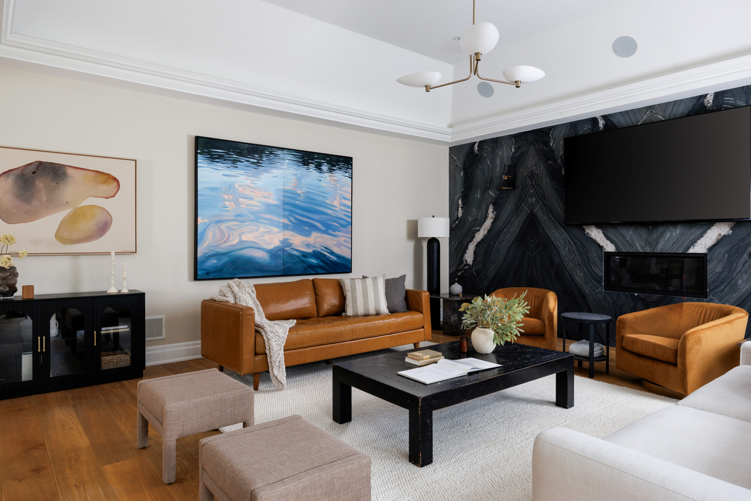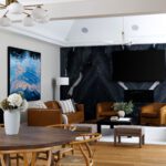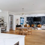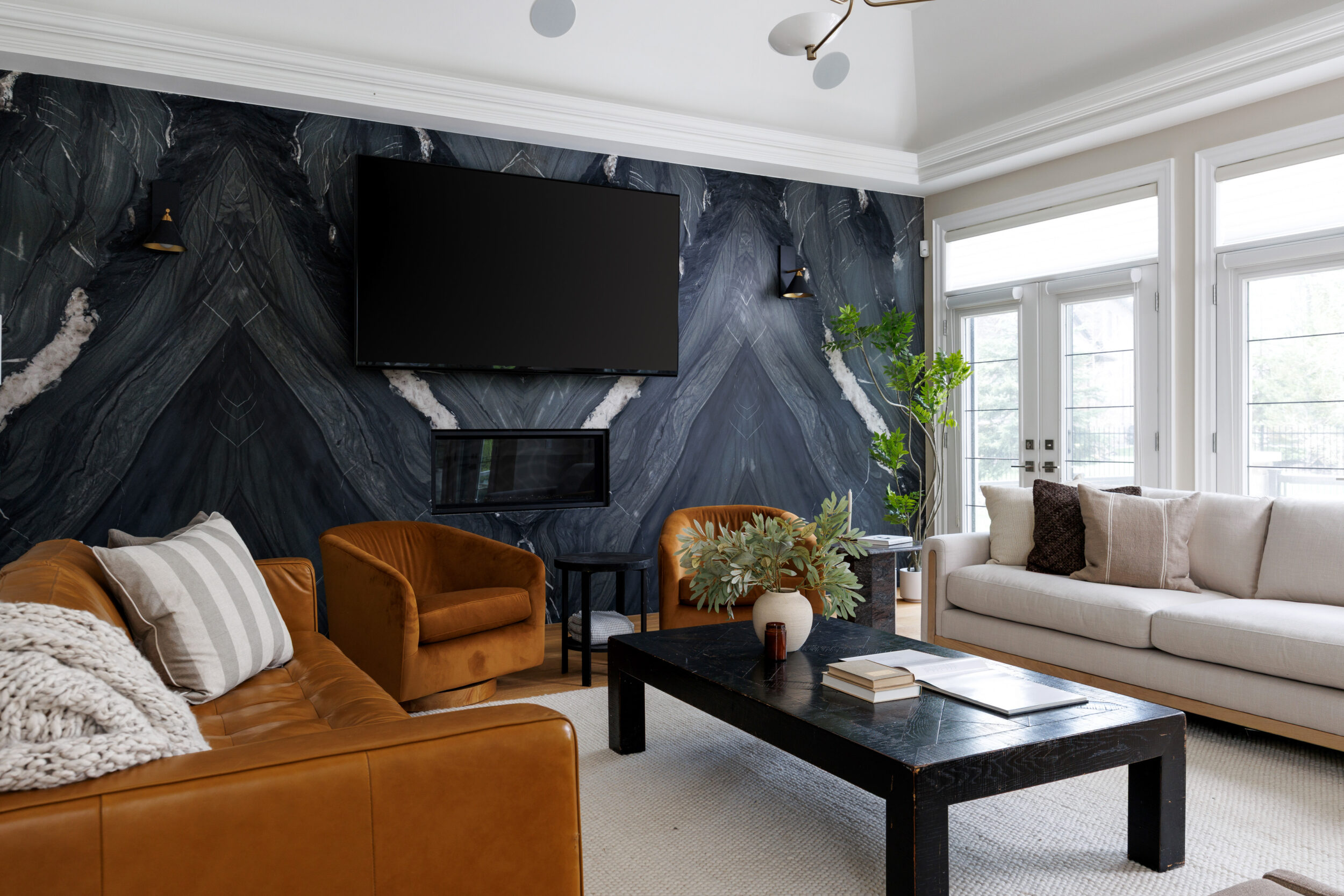 The principal rooms are generous without being cartoonish. A formal dining room with 10-foot trayed ceilings and art-gallery scale walls. A living room edited with the restraint of a well-travelled eye. A great room, anchored by a dramatic floor-to-ceiling stormy book-matched natural stone wall, the kind of feature that belongs in a design publication. Five sets of French doors along the West-facing wall open to the covered patio and the course beyond.