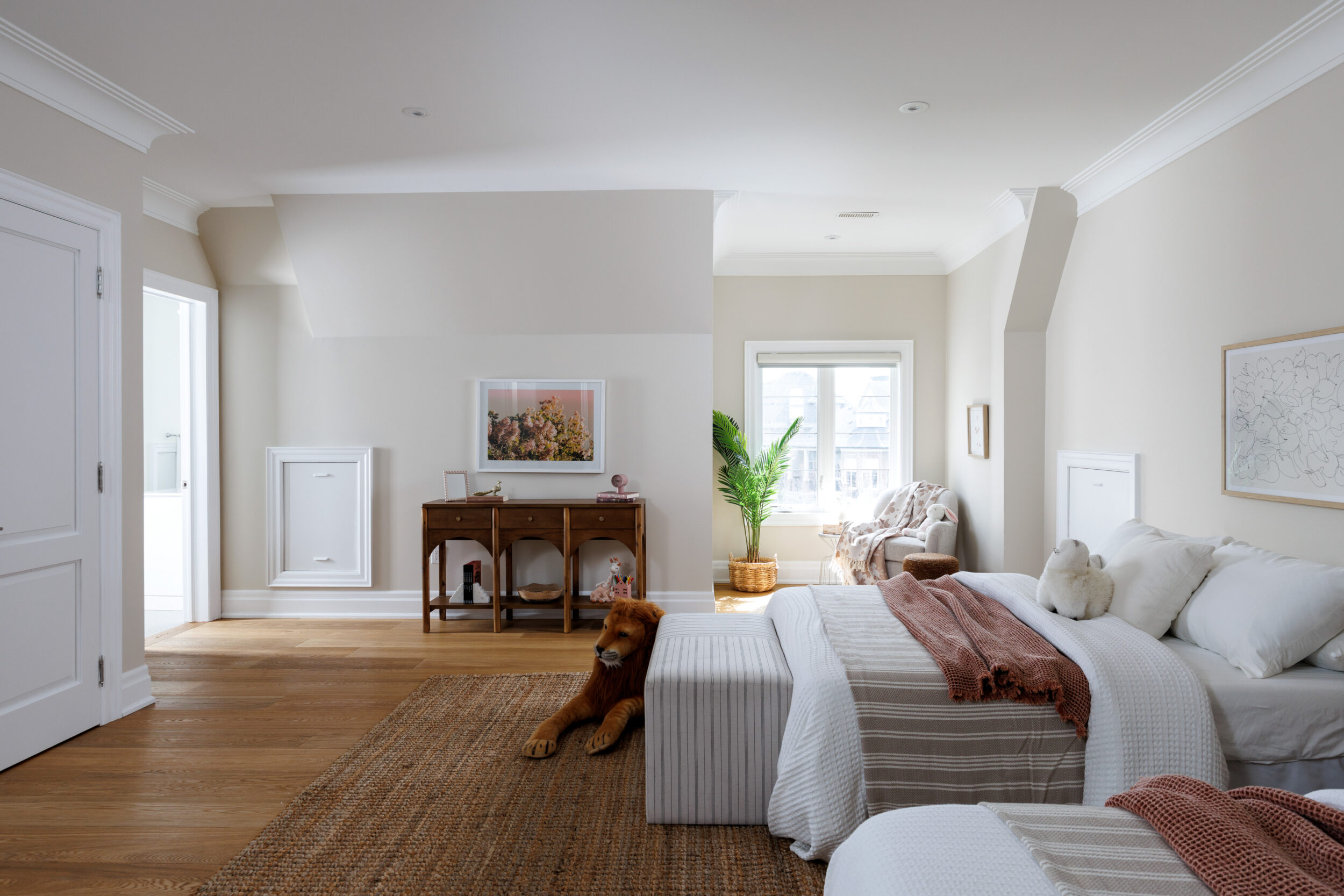 Three additional bedrooms round out the upper level. One has its own private bath. The other two are genuinely large rooms, the kind that comfortably absorb a king bed, a reading chair and a life. They share a well-appointed bathroom between them and work equally well for the family who stays longer than a weekend, the teenager who needs a door that closes, or the little one who hasn’t outgrown needing you close.